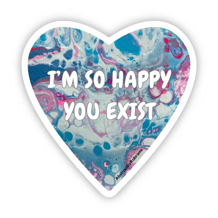 Blue and Pink Sticker that says "I'm so Happy You Exist"Each heart sticker is 3"x3" Sticker background is from an original painting of mine. This one is from a subtle trans pride painting- These matte laminated stickers are durable outdoors and ready to stick as bumper stickers, window stickers, and more.- Dishwasher and microwave-safe, and can be applied to food safe containers.- They are weatherproof and waterproof, but can't stay submerged in water (like on the bottom of a boat).
