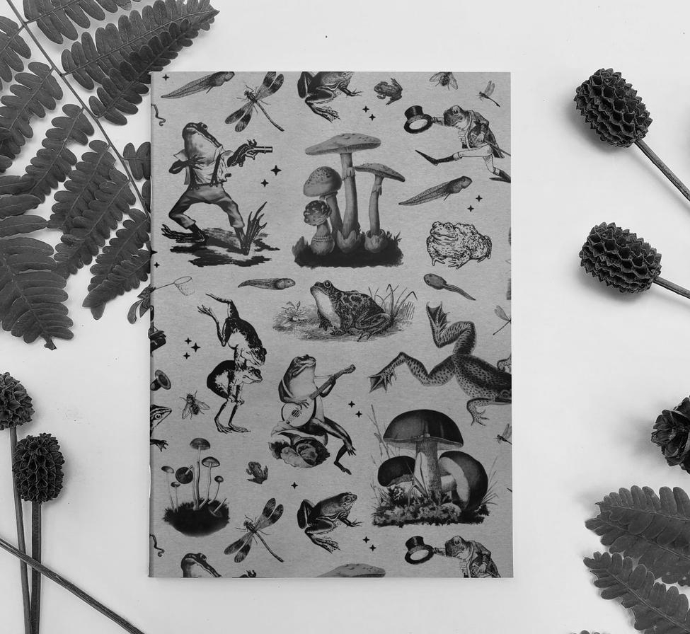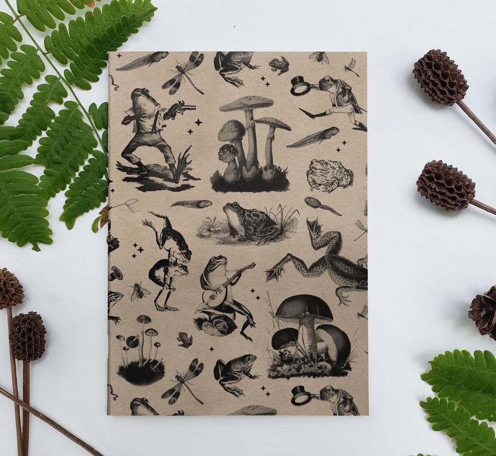 This beautiful sustainable 5 x 7" unlined notebook has a kraft cover featuring charming vintage frog illustrations. Packed in individual cello sleeve with info sticker.✔ 30 Sheets / 60 pages✔ 5" x 7" / 12.7 cm x 17.8 cm✔ 3/16" thick✔ Staple bound on spine with a square binding profile✔ Recycled kraft paper cover✔ Forest Stewardship Council (FSC) certified interior pages✔ Made in the USA