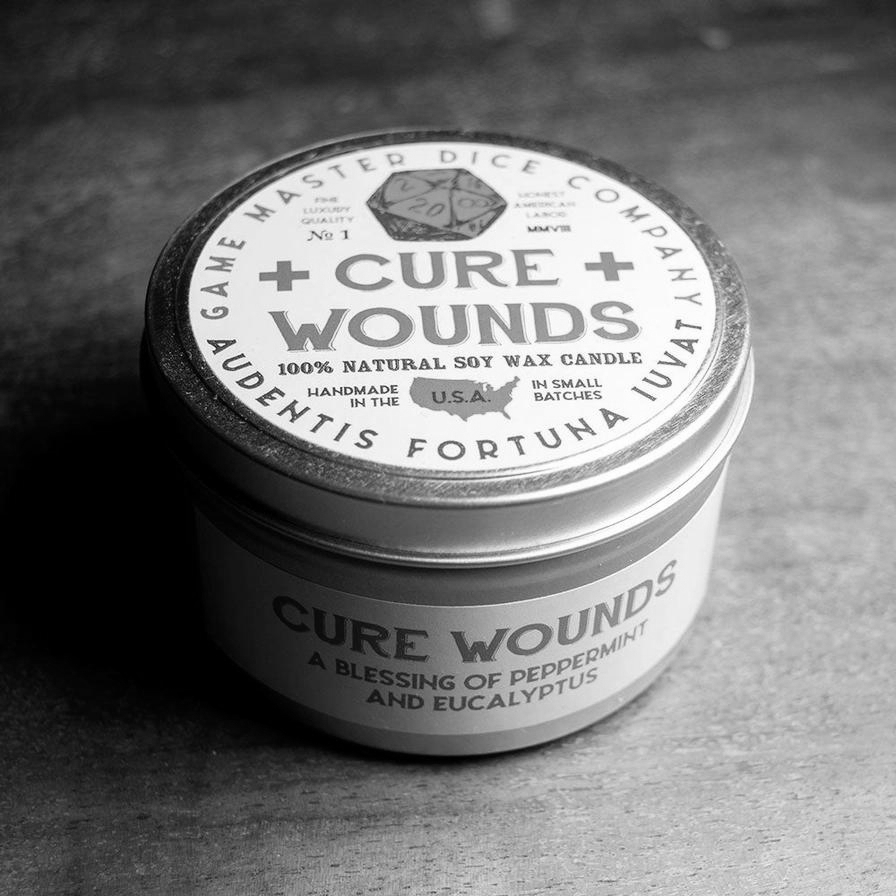 Clean and bright, let the fragrance of sweet peppermint and tingly, earthy eucalyptus refresh you. Hints of cedarwood and patchouli give depth to this pure, white, divine blessing of light.The 8oz version is labelled as "Cure Wounds," as an homage to the healing spells of different power from Dungeons & Dragons.Fragrance notes: * Top: Eucalyptus, Peppermint * Middle: Cedar, Clove * Base: Patchouli, Vanilla, Powder Key features: * Made of all-natural, sustainable soy wax * Made by hand in small batches in the USA * Inspired by the Cleric character class from Dungeons & Dragons * The perfect geeky gift * Burns for 40-56 hours