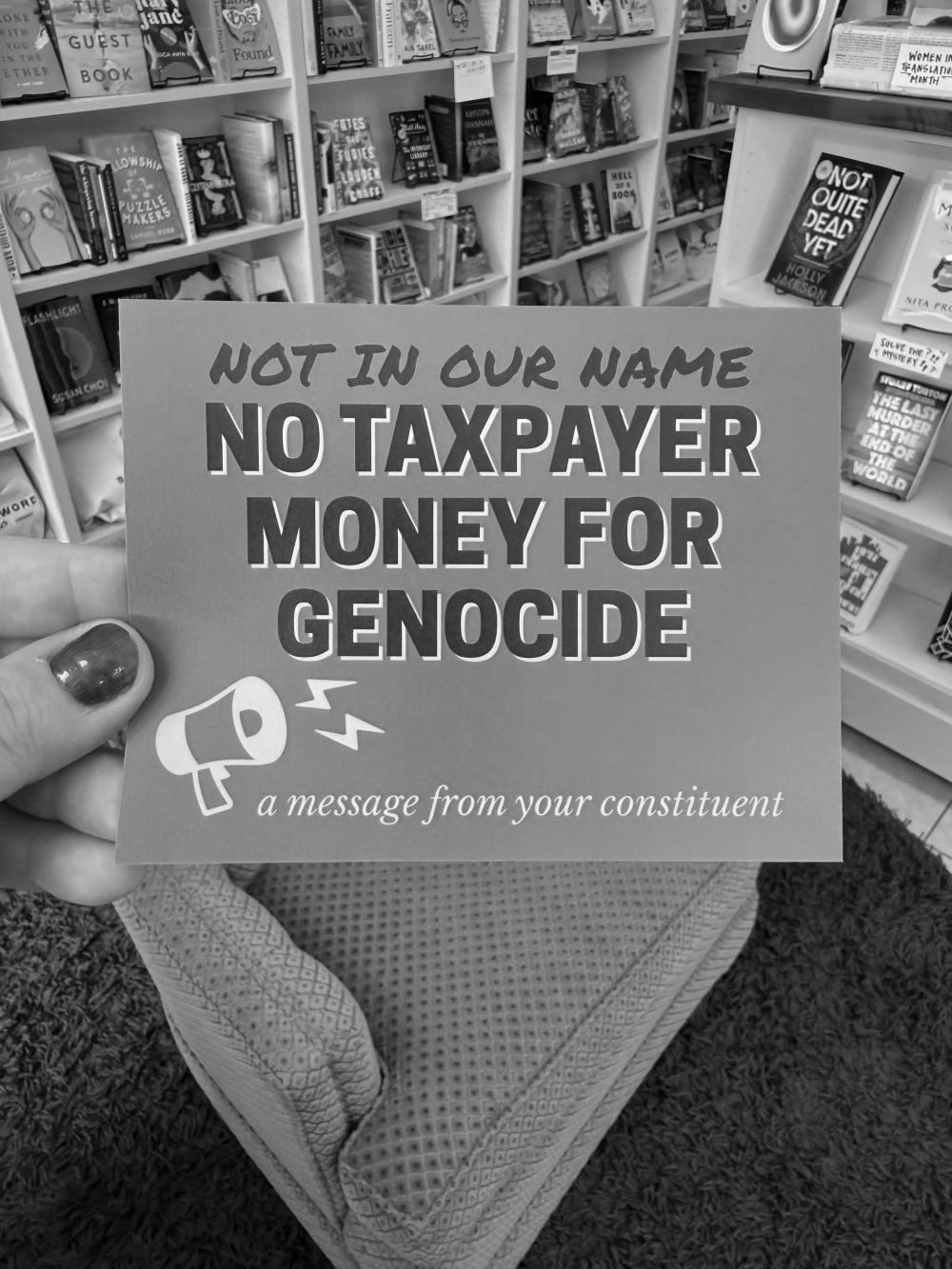 Strong Feelings Press Political Postcard: Not In Our Name/No Taxpayer Money For Genocide