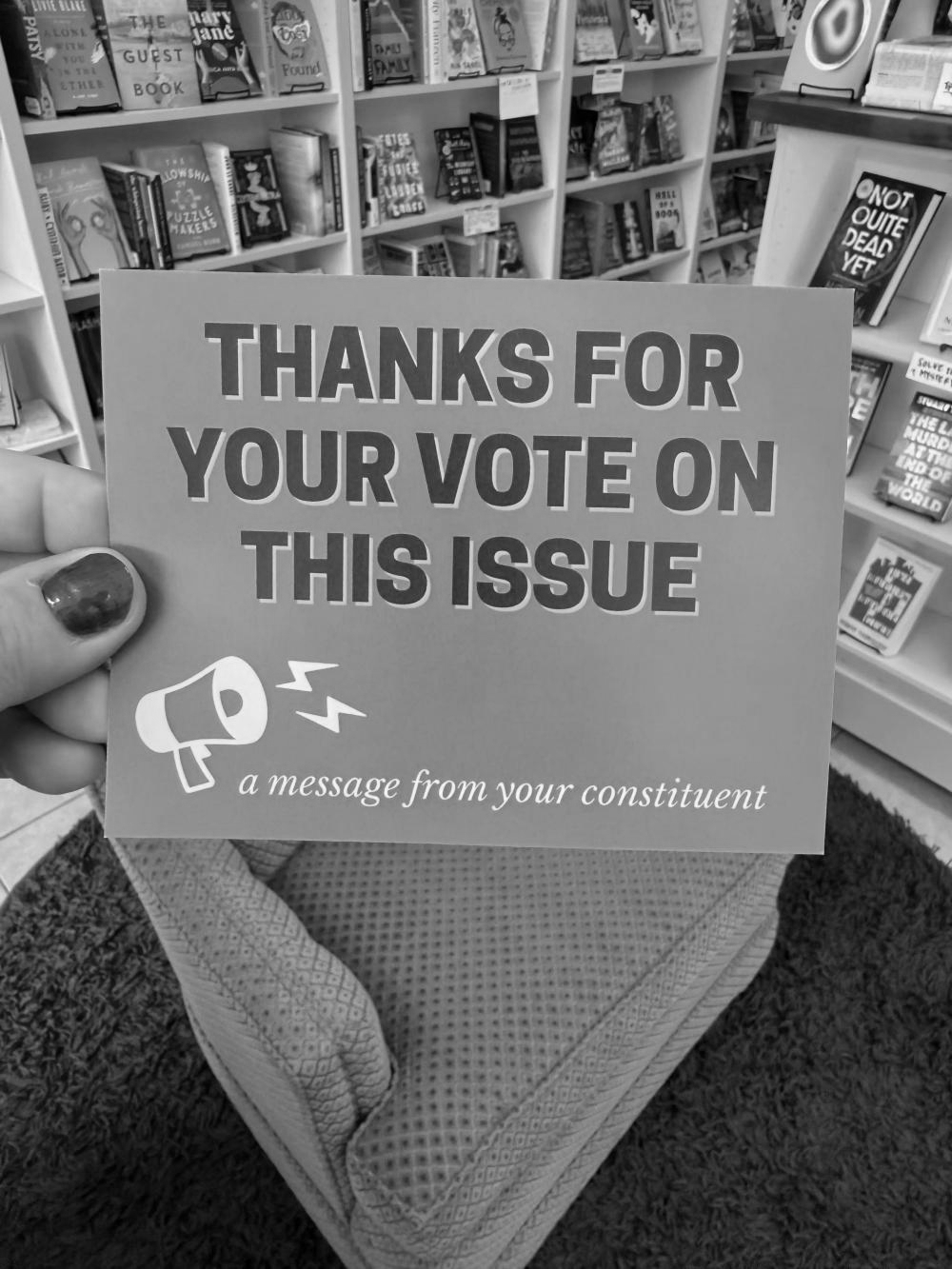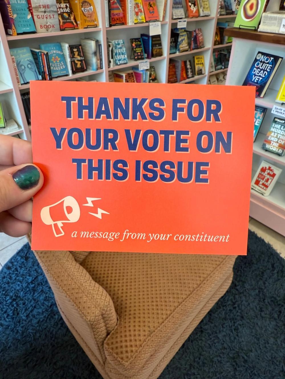 Gotta show some love to the ones we have in our corner. Send this off when your elected has got your back with an important or controversial vote.***Bold political merchandise for people with strong feelingsMake your voice heard. This ready-to-mail postcard delivers a clear message to your elected representatives. No design skills needed—just add your signature, a stamp, and the address of your senator, representative, or local official. There's room on the back to include some additional personalized feedback!𝐇𝐨𝐰 𝐭𝐨 𝐮𝐬𝐞:• Write a brief personal note on the back (optional but powerful)• Sign your name and include your city/zip code to show you're a constituent• Add a postcard stamp (or regular stamp)• Mail to your representatives𝐖𝐡𝐲 𝐩𝐨𝐬𝐭𝐜𝐚𝐫𝐝𝐬 𝐰𝐨𝐫𝐤:Physical mail gets noticed. Unlike emails that get filtered or calls that become statistics, postcards take up space on a staffer's desk and prove you're a real constituent who cares enough to take action.