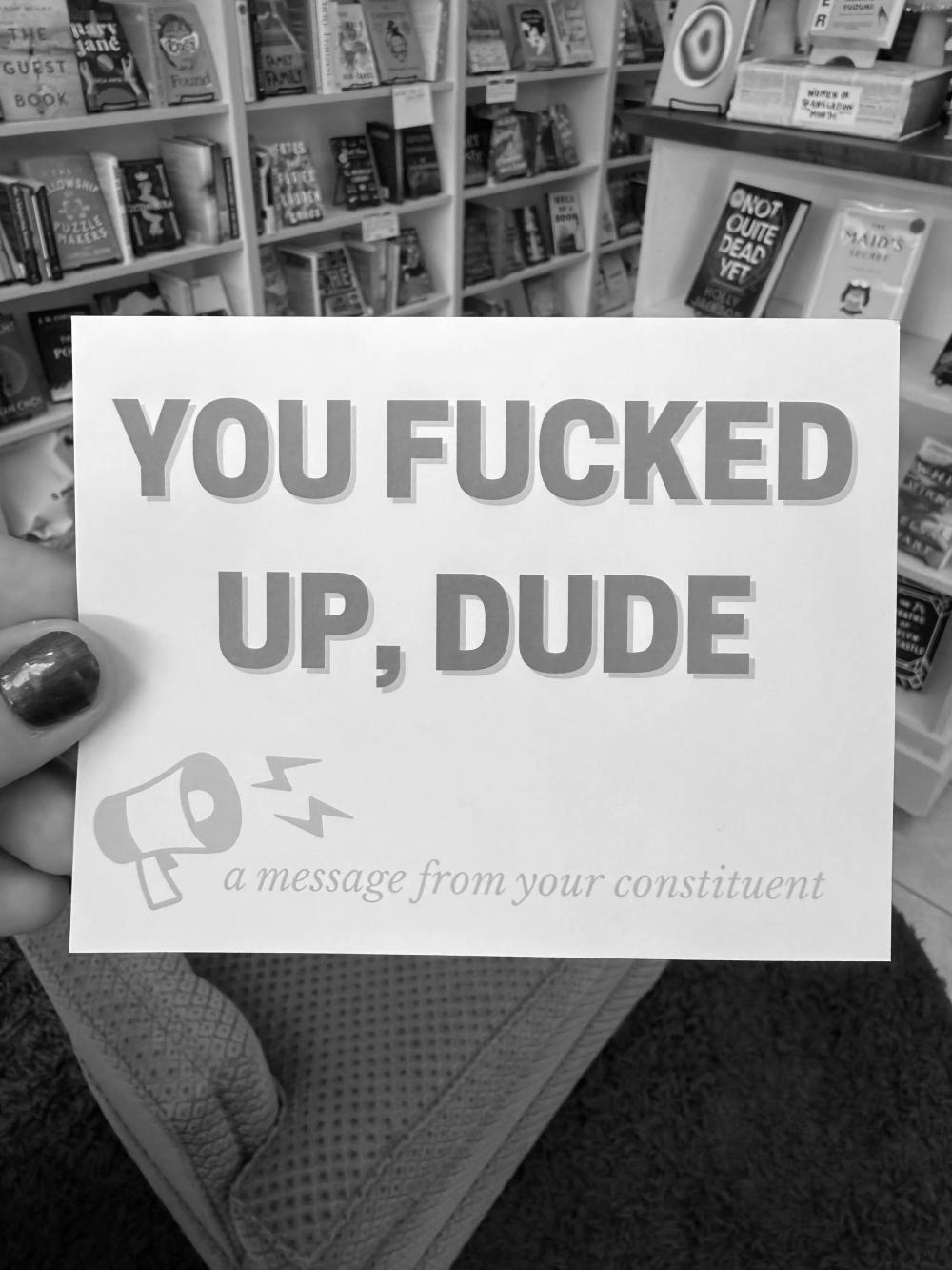 Strong Feelings Press Political Postcard: You Fucked Up Dude