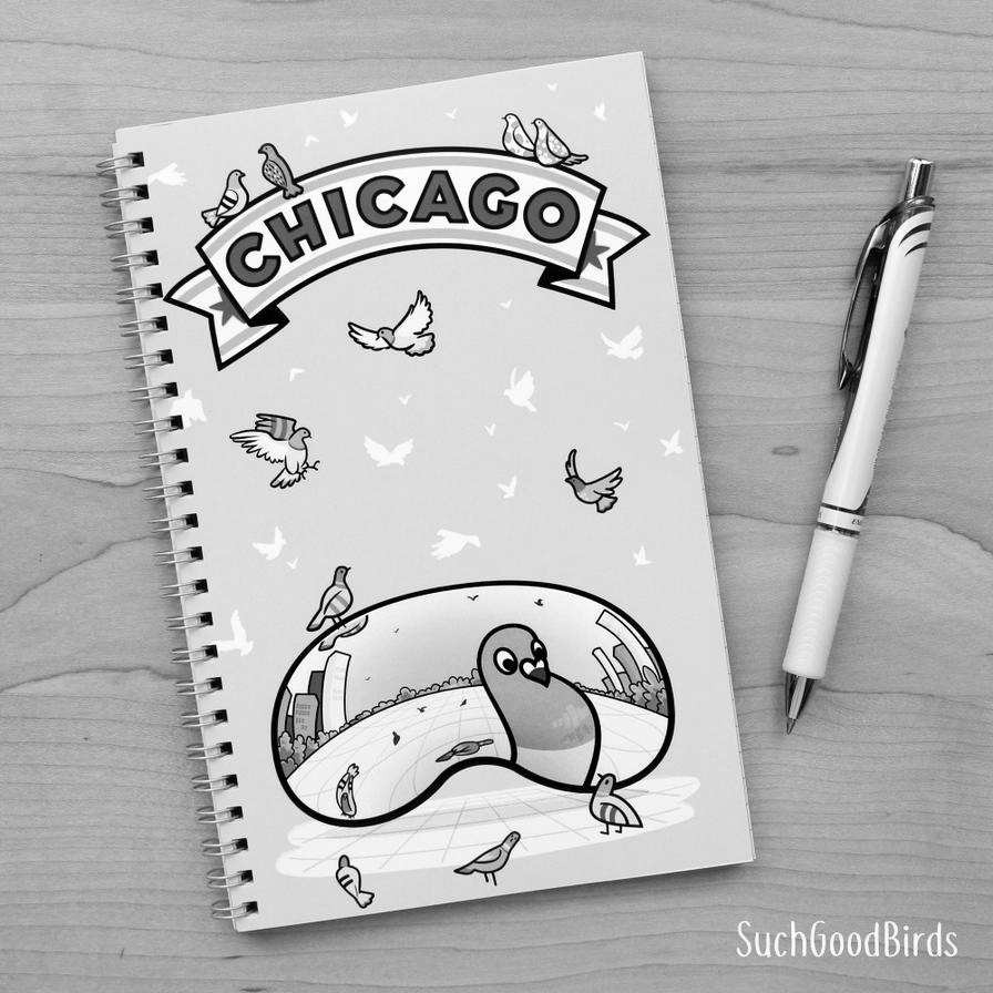 A notebook inspired by Chicago, Illinois! Featuring the famous Bean sculpture ("Cloud Gate") and the pigeons of Millennium Park.Perfect for stationery store and gift shops located in and around Chicago.• 5.5" x 8.5" (14 x 21.5 cm)• 45 sheets (90 pages front and back)• Spiral bound w/ silver metal wire• Design on front and back outside of cover• Blank on inside of both covers• Covers are 260 lb 2-ply heavy paper• 24 lb, college ruled blue paper inside(slightly thicker than regular copy paper)