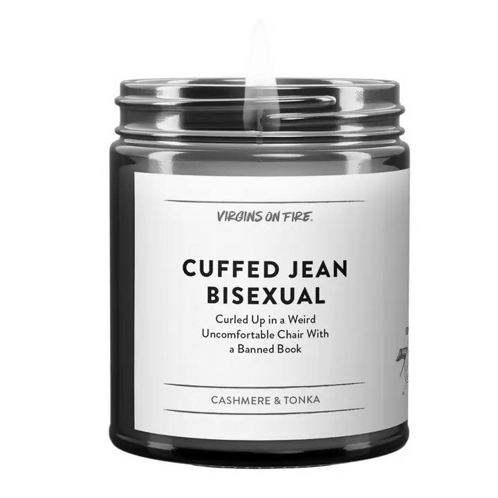 Cuffed Jean Bisexual Curled Up in a Weird Uncomfortable Chair with a Banned Book is a deep and sophisticated cashmere and tonka blend, it's as cozy as they come. Think purple velvet, or a fuzzy coat. Perfect for curling up in your weird chair.From Virgins on Fire Candle Co. these quality jar candles are made with 100% soy wax and handmade in Brooklyn, NY using only safe phthalate-free fragrances sourced from socially responsible suppliers.The 9oz candle with wraparound label carries a long 45-50 hour burn time.