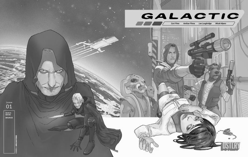 NEW DSTLRY SERIES DEBUT FROM CURT PIRES (Lost Fantasy, Indigo Children) AND AMILCAR PINNA (X-Men)!What if George Lucas and Quentin Tarantino f@#&ed and had a baby? That baby would be Curt Pires and Amilcar Pinna's GALACTIC. An ultraviolent interstellar romance that tells the story of a roguish bounty hunter hired to bring back a Princess on a death-bender on a hippy planet, and inadvertently find themselves caught in the crossfire of an intergalactic war.And maybe, just maybe, falling in love along the way!Did we mention there's a talking dog who pilots the starship?!For fans of STAR WARS, SAGA and SEX CRIMINALS.