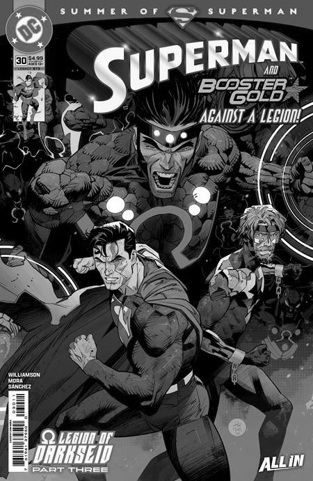 BOOSTER GOLD...FUGITIVE OF THE DARKSEID LEGION! Superman has found the mysterious hero known as Booster Gold. Together, they must return to the present day to warn the Justice League, but Darkseid's Legion stands in the way. The shocking events of this issue lead into next month's massive next chapter in the all in saga!!