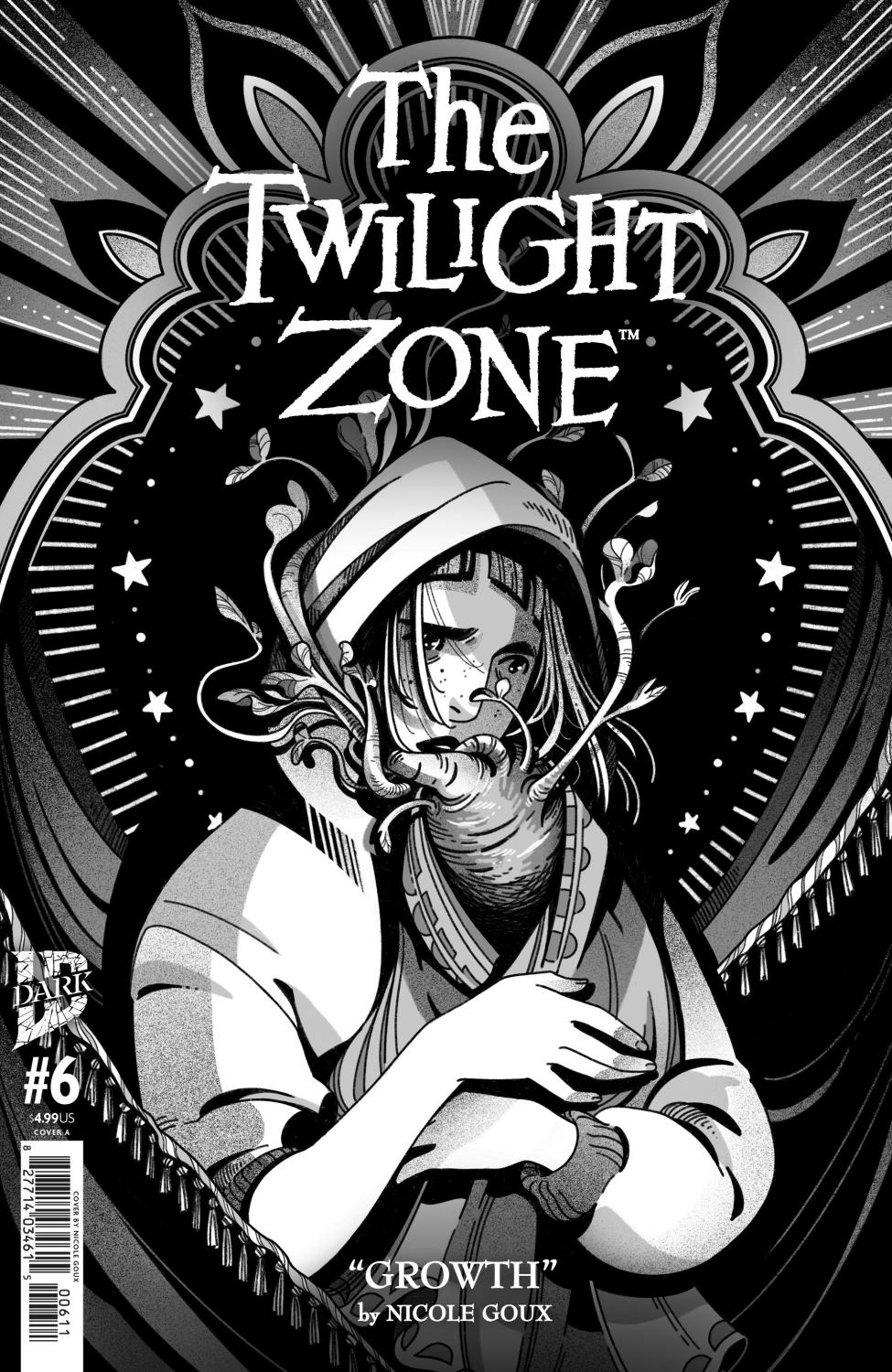 The Twilight Zone anthology returns with a new batch of standalone issues! Comic book greats bring us fresh stories in chilling black and white, just like the original television show.This issue: Piper can't take care of herself. She barely eats, and her apartment is a mess. In a last desperate attempt to quick-fix her life, she decides to order a food delivery service. But her first delivery includes an unexpected arrival: an unsettlingly baby-shaped vegetable. Its pudgy plant hands and feet may be too cute to eat, but Piper is about to learn that caring for another is far more complicated than caring for yourself. Especially if you love the other more than yourself... Nicole Goux (Shadow of Batgirl, Fuck Off Squad, Forest Hills Bootleg Society) welcomes us back to the Twilight Zone. Get cozy, dear readers. We're just getting started...