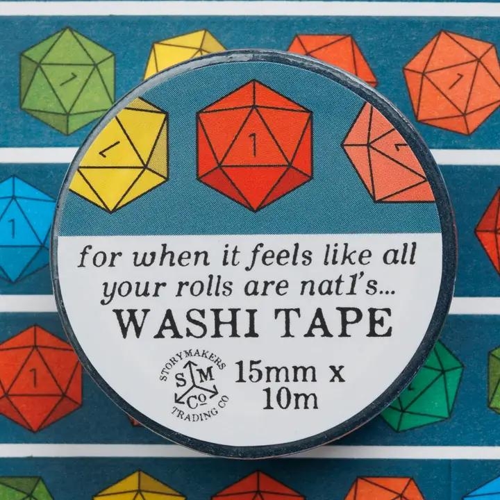 Sometimes life feels like a long line of nat1s. A washi tape for everyone who needs a better dice jail. Add this fun washi tape to your stationery displays for some TTRPG and fantasy gaming flair! Perfect for every adventuring party and gamer.Washi tape is a thin decorative paper tape similar to masking tape. Perfect for decorating bullet journals, planners, campaign notebooks, craft projects, and whatever else you could imagine.- 15mm washi tape- 10m length each roll