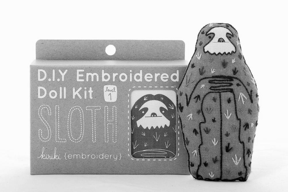 Sloth is a Level 1 pattern, great for beginners because it features basic stitches used sparingly.All Kiriki patterns are screen printed by hand with vibrant, water-based inks right onto the fabric so no tracing or transferring is ever required!D.I.Y. Embroidered Doll Kits include:• Screen printed pattern on cotton• Printed backing fabric• No. 9 needle• Range of DMC Embroidery Floss• Stuffing• Step-by-step instructions• Full size colour image of finished doll• Screen printed packaging - perfect for gift giving!