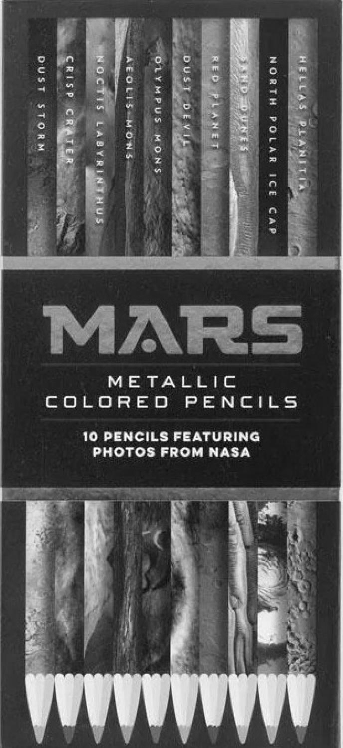 10 metallic colored pencils feature foil-stamped labels for Red Planet exploration and identification.Featuring Photos from NASA!• Great gift for anyone interested in space exploration• Perfect for notes, coloring books, or drawing• High-quality, two-tone art pencilsLet NASA's Mars imagery add color to your artistic and space quests!