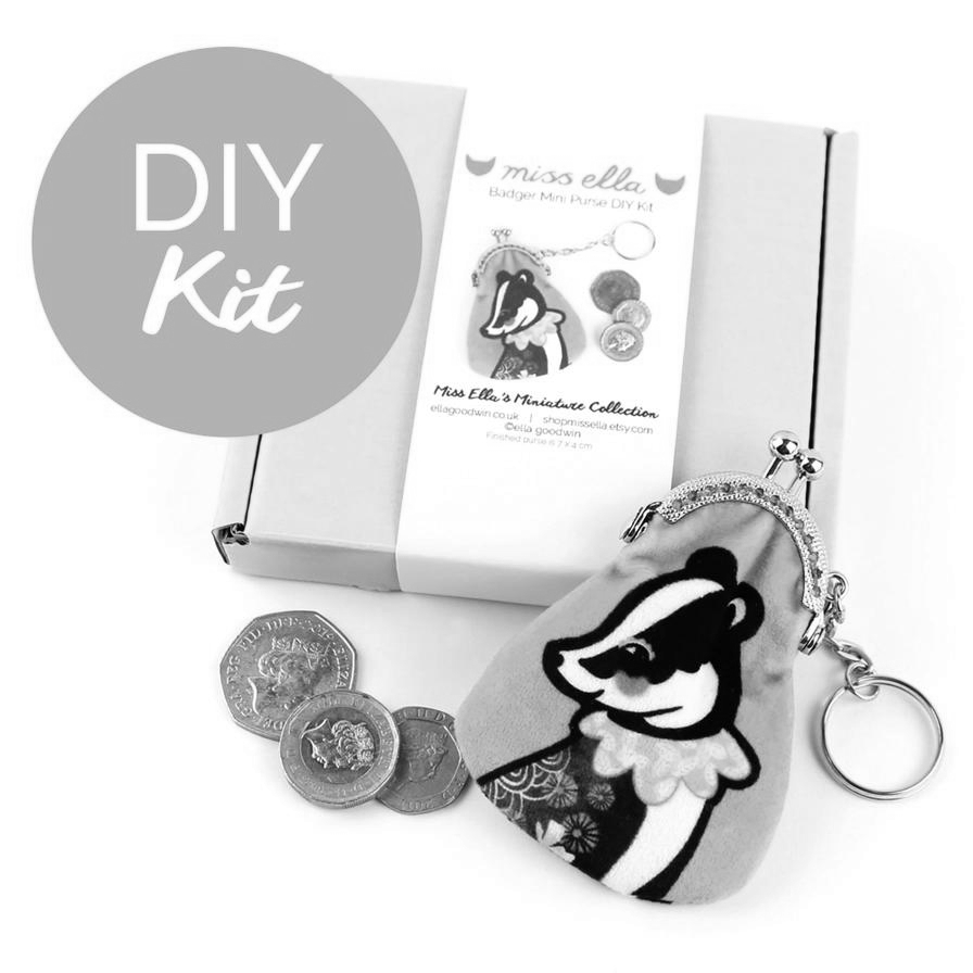 DIY KIT to make a super cute MINI Badger Purse! You will get all of the pieces you need, the purse is double sided so the illustration is on each side.Soft velvet printed with my badger design, lining fabric and metal kiss clasp to click it shut and keep your valuables safe and cosy! Comes with full tutorial video, you can sew by hand or machine or give a kit to a sewing pal!The finished purse is small and super cute so fits in the palm of your hand, the key ring makes it perfect to dangle from your bag or give to a friend with a secret message inside.Kit contains - Velvet outer fabricCotton inner fabricFull Video Tutorial linkClaspMeasurements of finished purse - Clasp - 4cm wideFull purse size including bobble is 7cm x 4cm.