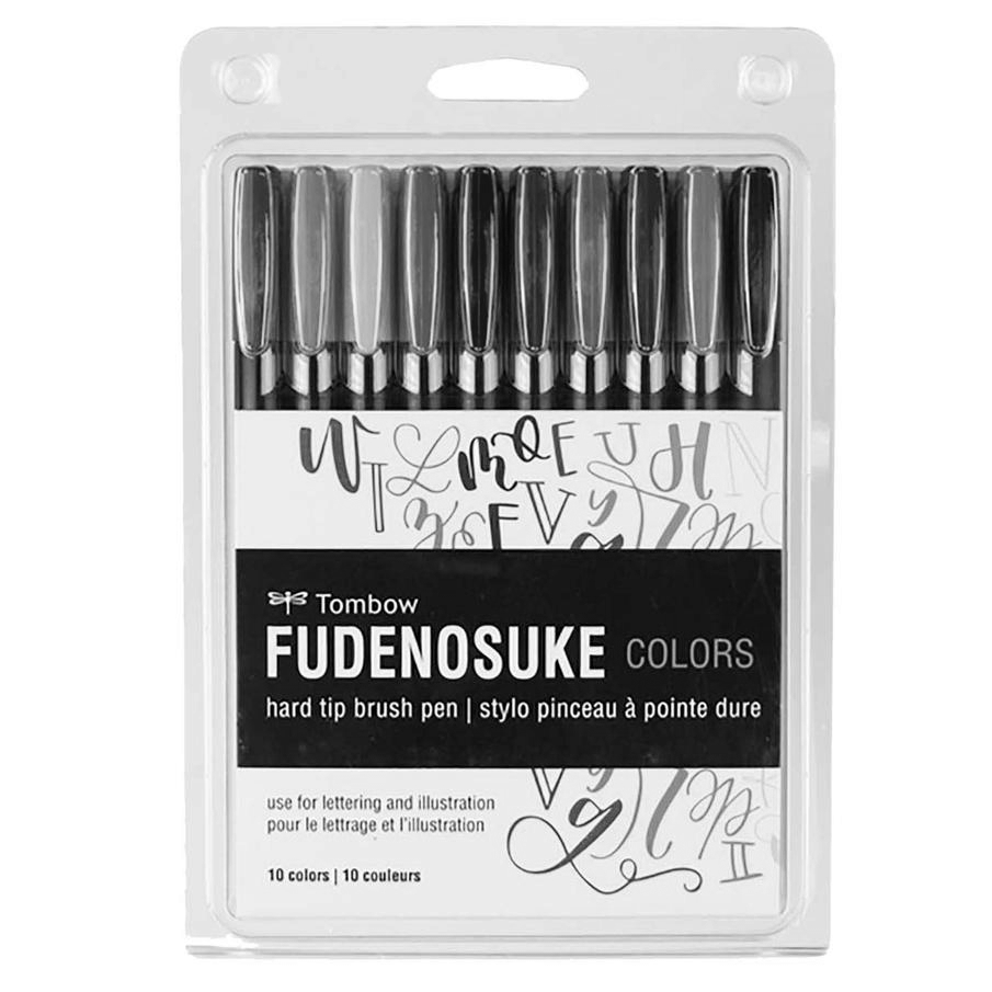Fudenosuke Brush Pens with flexible brush tips allow easy transition from thick to thin lines by changing pen pressure. Markers feature water-based pigment ink that provides rich vibrant colors that won't bleed through most papers. Great for beginner brush calligraphy, hand lettering, and illustration. Non-refillable. Contains 10 hard tip Fudenosuke Brush Pens. Marker colors include: Black, Gray, Red, Orange, Yellow, Green, Blue, Purple, Pink, and Brown.