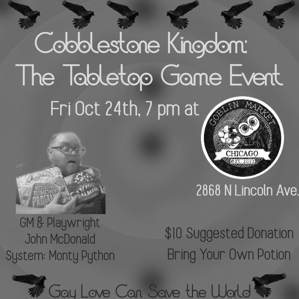Join John McDonald and a crew on a quest in Cobblestone Kingdom to make sure the prince and his Cinderfella meet at their ball the very next night. They'll succeed in their quest or die trying! It's only the fate of the whole universe, after all. Come be a part of the magic on Friday, Oct 24th at 7 pm in the exceedingly cozy Art & Commuity space at Goblin Market! Bring your own bevvys and get ready to cheer on the good guys and boo the French! (Bad guys may or may not be French at time of game play.)