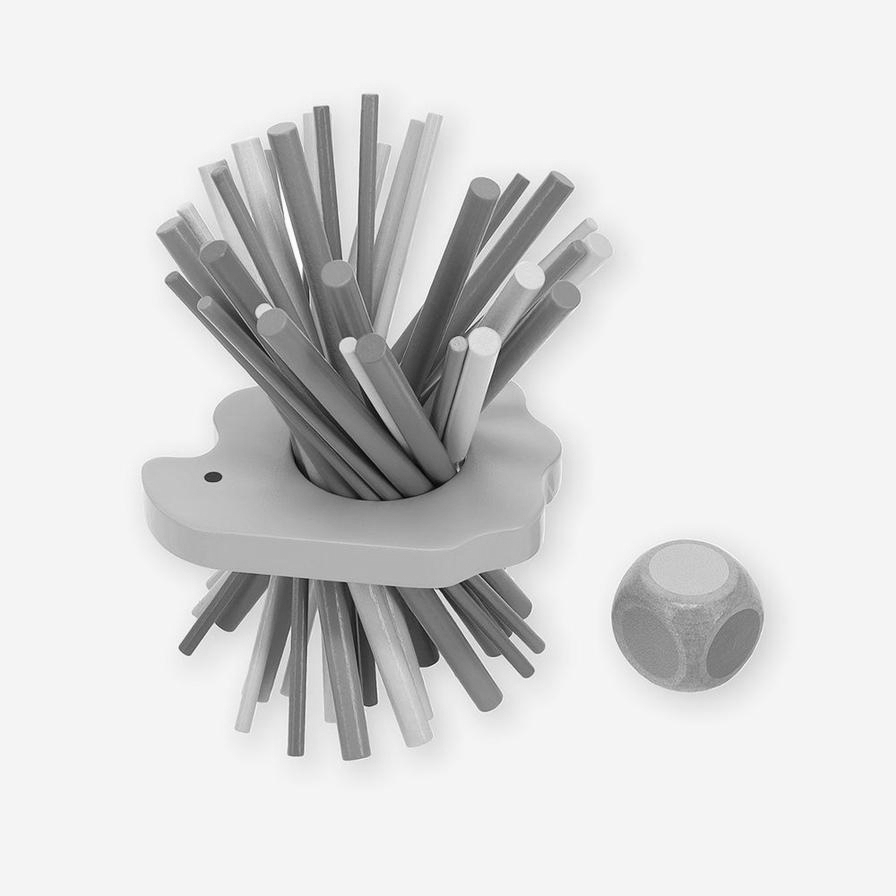 A prickly twist on the classic game of pick-up sticks! Collect sticks without disturbing the wooden hedgehog to earn points. The player with the highest score when the hedgehog falls is the winner!Roll the die to determine the color you’re playing with, and then ever so gently remove a stick of that color from the bunch. But be very careful because with each stick that’s removed, the balancing hedgehog will become more and more unsteady, and when it drops, the game is over. And there’s an extra prickle! If the die lands on the hedgehog icon, you can invent a rule for the next player to follow on their turn. Something like “Keep one eye closed” or “Sing a song”—it’s totally up to you!
