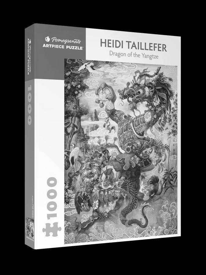 Heidi Taillefer (Canadian b. 1970)Brewing the Yangtze, 2000Surrealism, humanism, and mythology meld in the dynamic work of Canadian artist Heidi Taillefer. In this large-format oil painting, a five-clawed royal dragon represents China’s longest and most important river, the Yangtze. The imagery is replete with symbols of Chinese culture: golden carp suggest wealth and prosperity, cranes represent longevity and wisdom. And disembodied human hands—whether reverently clasped or holding a ceremonial weapon to pierce the dragon—allude to the interplay of humankind with the natural world. Nicknamed “the dragon lady” as the result of a childhood obsession, Taillefer deepens her fascination with dragons and Chinese mythology in Brewing the Yangtze, reproduced in glorious detail on this 1000-piece jigsaw puzzle.• Gather with family and friends for puzzle-piecing together!• Our luxury puzzles are crafted with attention to every detail.• High-quality 250-GSM matte artpaper for superior color, crisp details, and no glare.• Ribbon-cut thick board for snug fit and minimal dust.• Produced using thick recycled paper board.• Exclusive selection of art from museums and artists around the world.Box size: 10 x 13 x 1.875 in.Puzzle size: 20 x 27 in.