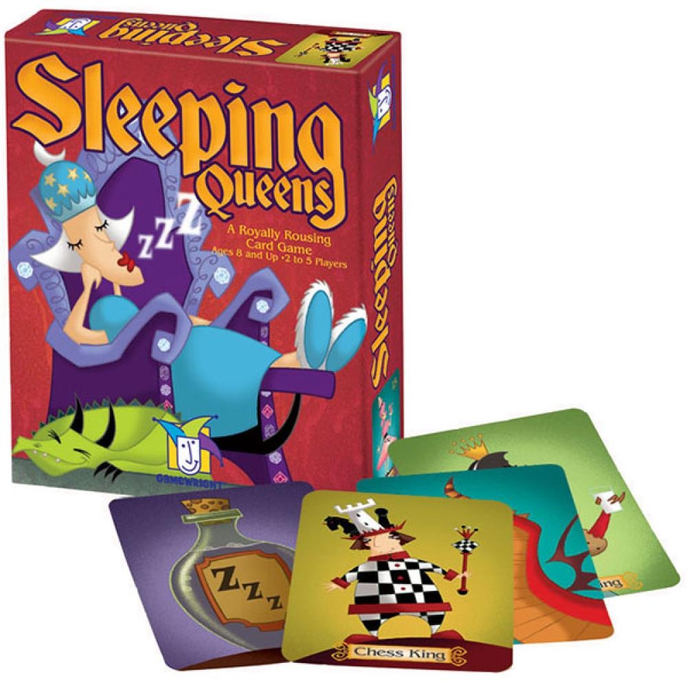 Rise and shine! The Pancake Queen, the Ladybug Queen, and ten of their closest friends have fallen under a sleeping spell and it's your job to wake them up. In Sleeping Queens, players need to use strategy, quick thinking, and a little luck to rouse these napping nobles from their royal slumbers. The twelve queen cards lie face-down on the table. On a turn, you take one action from the cards in your hand: play a king to awaken and claim a sleeping queen, play a knight to steal someone else's queen (unless she has a dragon for protection), play a wand to send a queen to sleep once again, use a jester to try our luck with the top of the deck, or discard one or more number cards to draw more cards. Each queen card has a point value on it, and whenever all the queen have been awakened or one player hits the point threshold, the game ends and whoever has the most points wins. Players: 2-5 players, ages 8+. Play Time: 10 minutes.
