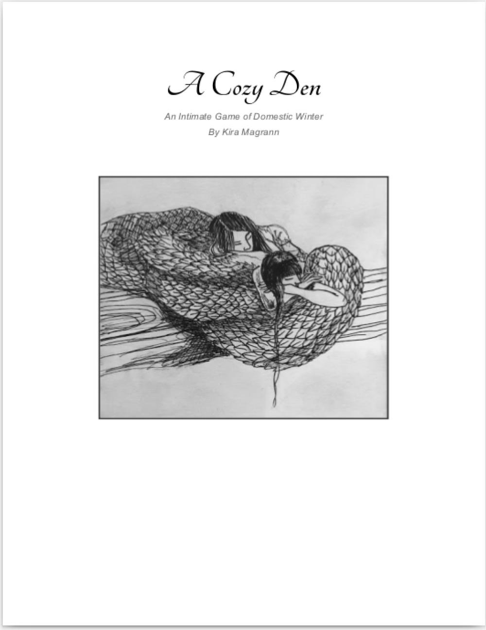 A Cozy Den is an intimate game of domestic winter. Players roleplay as Lesbisnakes who all have different needs in their Den and various ways of approaching these needs, from cuddling, to napping, to wrestling. Lesbisnakes are half snake, half human, and all lesbian. Various threats are waiting outside of the Den throughout winter putting stress on the Lesbisnakes feelings. Can the Lesbisnakes maintain a community of coziness during the overwinter time?