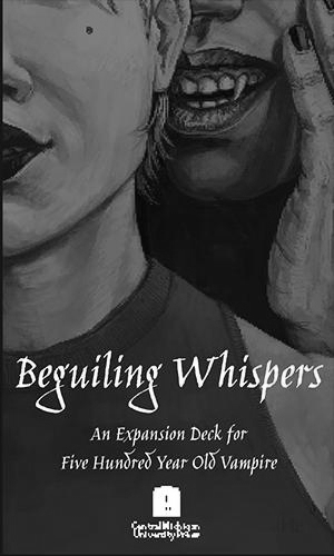 A 36 card expansion deck for Five Hundred Year Old Vampire that helps facilitate multi-cohort play. Requires a copy of Five Hundred Year Old Vampire to use. It is not a standalone game.In a multi-cohort game, the Prime Vampires become much more visible with the addition of the Beguiling Whispers expansion deck. When the Cohorts switch decks from Neophyte to Elder, Elder to Ancient, and Ancient to Conclusion, the Grave Keeper puts one card from the Beguiling Whispers deck in front of each Cohort.Only one Vampire in the Cohort may claim the card, although nobody within the Cohort is obligated to do so. Players may not look at the card before deciding to claim it. If the card is taken, the effects on the card will take place as described. The Player who claims the card is only obligated to share its contents with Players whose Characters are affected.Each Beguiling Whispers card includes a short narrative text in the voice of a Prime Vampire to provide context for the card’s effects. These texts are intentionally manipulative and toxic, as befits a creature as monstrous as the Prime Vampire. The effects of the card generally grant a boon to the Vampire who claims it, but also create a point of tension with another Vampire.