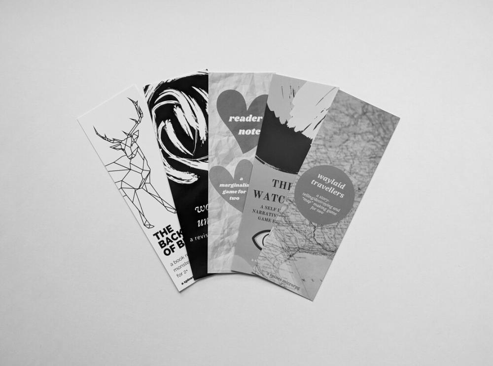 A collection of 5 micro RPGs of single-player, 2 player, and 2+ player games to be played with a book, printed on full-color cardstock bookmarks. With these games, write, draw, connect, and black out parts of the book to make something new with them. All you need is a pen or a pencil and a book. The collection includes: The Backbone of Beasts - a blackout poetry bestiary creation game for 2+. Select words to build your beasts and block out everything else until the pages include only descriptions of strange creatures. Waylaid Travellers - a story-building and map-making game for two. Encircle words that tell a story of a destination, connect these waypoints throughout the book. Words moving point by point are connected throughout the pages that build both a story and a map. The Watcher - a self-insert narrative horror game for one. Turn any book into a horror book by imagining yourself present in every scene as you read through a novel. As the story unfolds, imagine the characters noticing you as they go about their lives, persistent and silently watching them. Reader's Note - a game of speaking through the margins, for two. As you read a novel, keep in mind the person who would like it and to who you will gift it after you are done. Leave little notes in the margin for them for when it’s their turn to read. Thoughts, musings, and jokes that you want to share with them. Words Unsaid - a story revision game for one. For the times when a book has characters that just don’t make sense. When reading a book that is less than enjoyable, take the time to rewrite and revise the characters, to be more interesting or a little more three-dimensional.