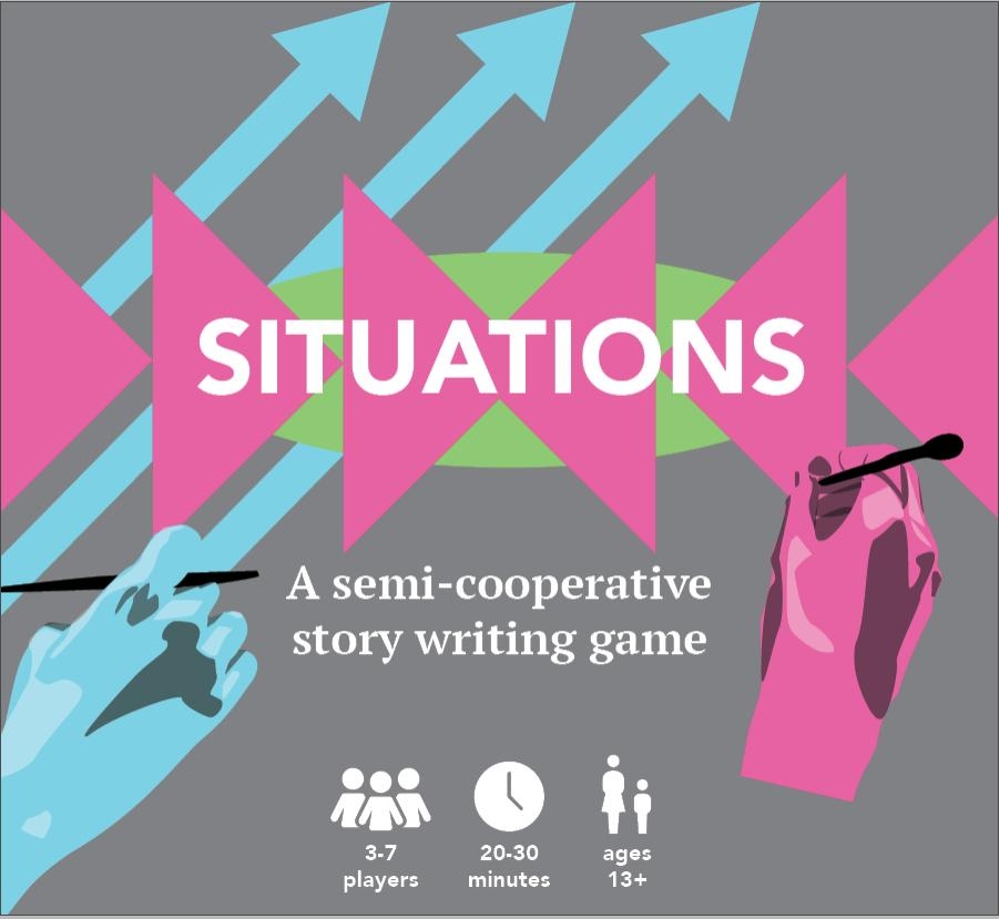 What is Situations?Situations is a 1-6 player GM-less boxed card game where you and your friends (or acquaintances, or classmates, or family, or mortal enemies) construct the situation of a story together, taking turns adding people, events, places, and so on, and then each player writes their own story by interpreting the web of relationships they just created! It's a way to get creative with your friends, help you find time to write, or force the people around you to figure out how exactly a shark would go to university. Situations was funded by a successful Kickstarter campaign, and is available now in physical as well as print and play digital format!Playtime is around half an hour.How do you play?It's pretty simple. Everyone (up to 6 people) gets a hand of cards. Most of these cards are blue noun cards - people, places, things, or events. A starting player puts one down, and then players take turns adding noun cards by answering the questions on the sides of the cards.Players can also use adjective cards (either played with a noun card or on a separate turn) to add flavor to the game.There are also special cards: And cards and Is A cards. These let you say things like "the Villain is a Ghost" or "The Mentor has a Mullet and a Motorcycle."The players then use their imaginations to fill out the bare-bones ideas of the prompt into a unique story, written on an index card. If there's a villain preventing a marriage, who is the villain? What makes them villainous? How are they preventing it? (They don't need to use the words on the cards - the cards refer to the concepts that each story should have.)After everyone has finished writing their stories, the players shuffle the index cards and each person reads a story, keeping secret whether it's their own or someone else's. When all the stories have been read, the players vote on whose story is the favorite, and whoever wrote the most popular story wins the round!
