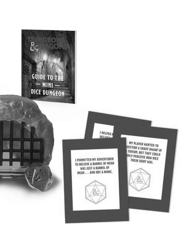 Keep your dice in-line with this official Dungeons & Dragons mini Dice Dungeon!Punish or put your dice in a time-out when they roll critical fails or put your friends (and yourself) in danger with the Mini Dice Dungeon. • LIGHT-UP DICE DUNGEON: Includes a 3 inch mini dungeon with LED light feature in green• SPECIAL BRANDED D20: A translucent d20 branded with the D&D ampersand for the 20• ILLUSTRATED MINI BOOK INCLUDED: With tips, advice, and the basics of dice care, and tear-out shame cards