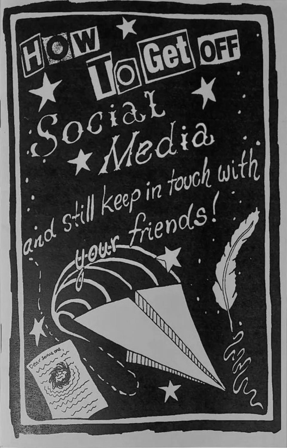 With a strategy for maintaining your relationships outside the confines of the internet, this little zine is part personal reflection on the merits of unplugging and part instruction manual for successfully extricating yourself from the ever-more-nightmarish world of social media. Author Sylvia Friday reflects on the uses of social media, and offers a critique of the ways that social media (especially for artists) has reduced art to a vacuous process of the capitalist cult of productivity. Friday calls for us to embrace snail mail and the beauty of ink and paper as a way to slow down, be creative in new and different ways, and engage more meaningfully with our friends through the process of writing physical letters on actual pieces of paper.