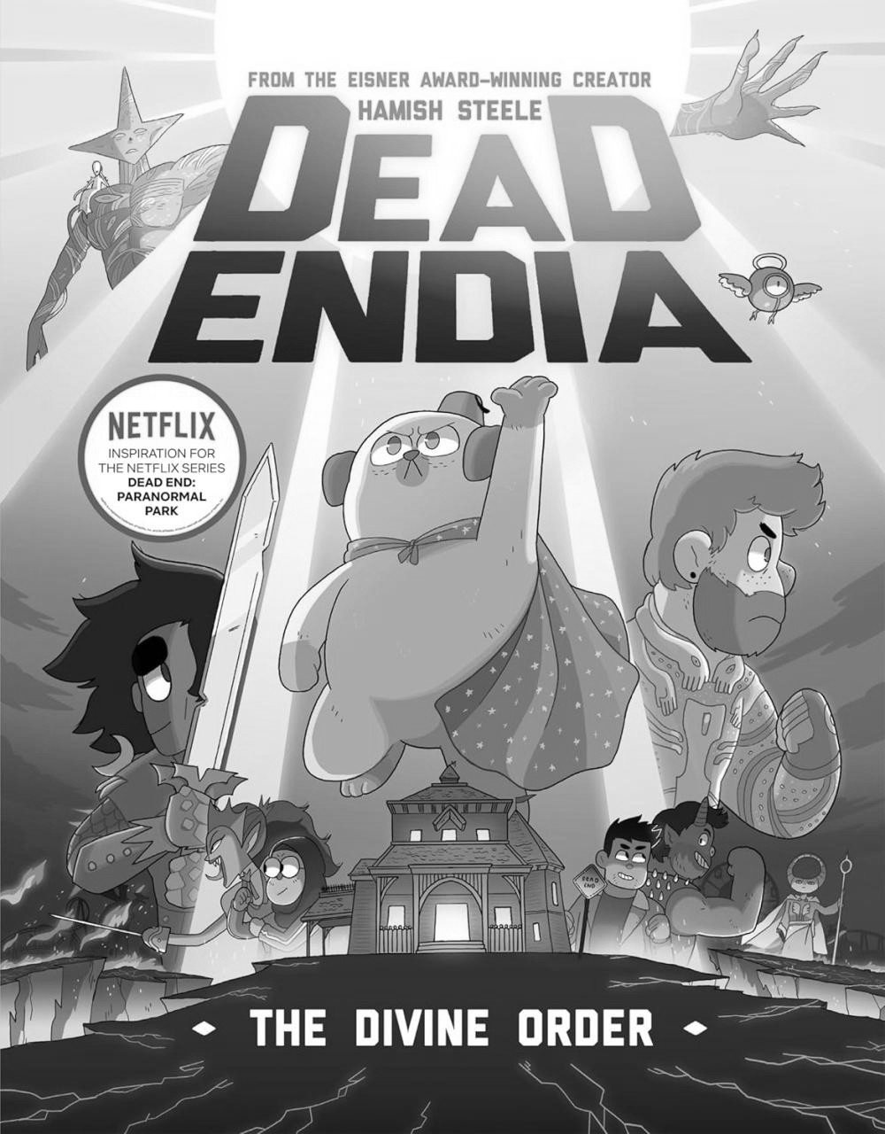 Eisner Award–winning creator Hamish Steele’s DeadEndia series is Steven Universe meets Adventure Time for fans of Scott Pilgrim, Rick and Morty, Adventure Time, and Pumpkinheads.In this diverse young adult graphic novel, third in the DeadEndia trilogy, Barney, Norma, and friends team up with unlikely heroes to fight a battle for the fate of the universe, all while dealing with their greatest challenge of all: their love lives.The battle between angels and demons rages on, and Courtney finds themselves restored to former glory in the realm of the angels with a new mission: bring about a new Divine Order and create a fourteenth plane of existence to keep the demons at bay. On the seventh plane, known to us as Earth, Norma Khan and Barney Guttman have allied with the demons in a search for both freedom and peace. There’s just one thing standing in their way: the Guttman family reunion. Badyah has joined the resistance as well, honing her martial arts skills and getting ready to protect Norma in battle.But Pael, the Divine’s lead angel, has tricks up their sleeve that throw everything into chaos as Norma, Barney, and Badyah learn the truth behind everything. The three friends struggle to stop Pael before their lives are changed forever, and a familiar friend returns with a power that just might save them all in this stunning conclusion to the DeadEndia graphic novel series.Part workplace comedy, part supernatural horror adventure, with a splash of LGBTQ+ romance, The Divine Order is perfect for fans of author Hamish Steele’s Netflix original TV series Dead End: Paranormal Park who are in search of more adventures, for graphic novel lovers who want more diversity in their reads, or for anyone who has finished The Watcher’s Test and The Broken Halo and is ready for the final entry in the zany, creative, and laugh-out-loud funny world of DeadEndia.