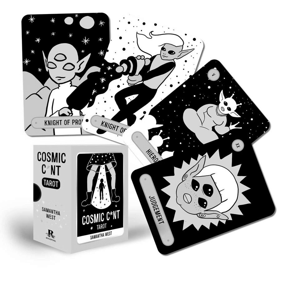 The Cosmic C*nt Tarot is a tongue-in-cheek, fun, pocket-sized tarot deck designed for the alien-loving reader.Full of alien probes, ray guns, test tubes, and UFOs, this deck follows the traditional 78-card structure, with some small, mischievous changes. The suits have been swapped out to include ray guns, specimens, disks, and probes.In case it's not abundantly obvious, this deck is not for the faint of heart. If you clutch your pearls at the sight of aliens wielding phallic probes, this may not be the deck for you. However, if you possess a cosmic c*nt (one capable of abducting farmers from their land) and love all things ray gun and UFO, this deck will help you embrace your power and delve into your own psyche.