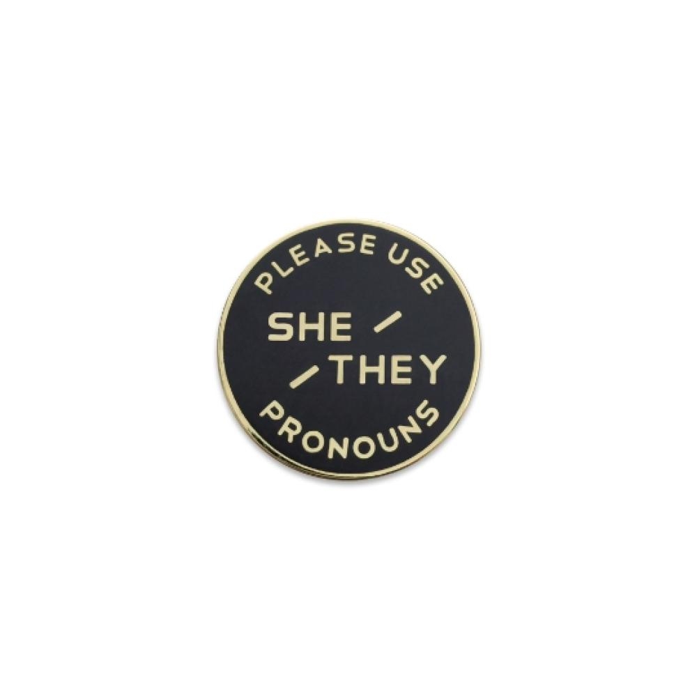 Black & Gold Enamel Pronoun Pin with Magnetic Back: She/They
