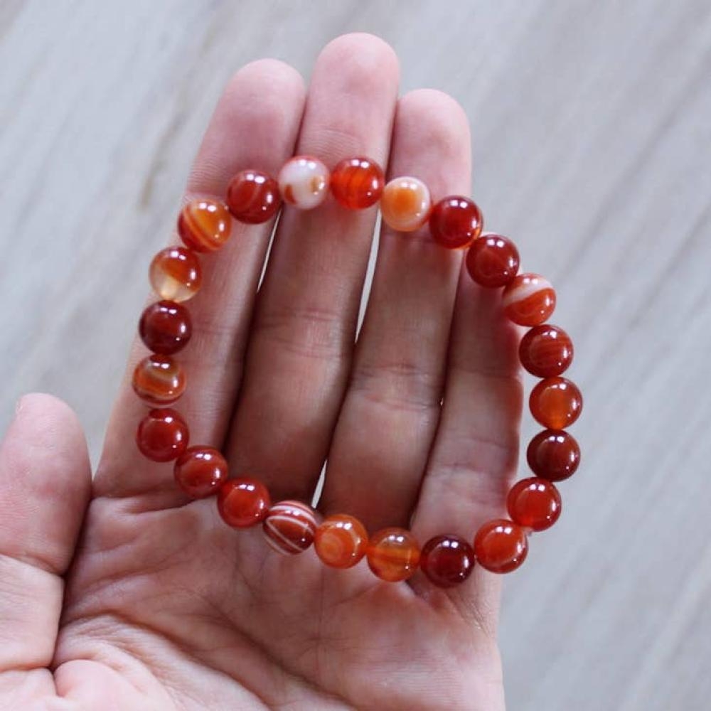 Carnelian stimulates motivation and creativity. It brings courage and a great motivation for success. It is useful for overcoming abuse or hardship of any kind. This bracelet consists of 8mm beads on a stretch cord. The beads have a shiny finish.