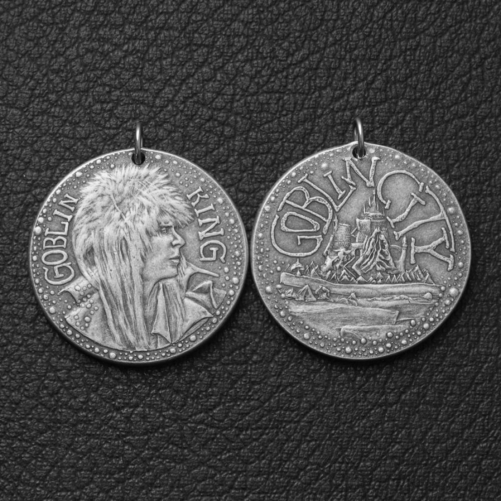 After following advice from a worm, have you found yourself lost at the center of the Labyrinth? Buying a chicken, baubles, a crust of bread, or dubious directions is a piece of cake with this coin. This exquisitely crafted piece features a portrait of the Goblin King. The spherical detail on Jareth’s collar expands into the border of each side of the coin. Perhaps each bubble holds a magical masquerade, perhaps it holds nothing tra-la-la.