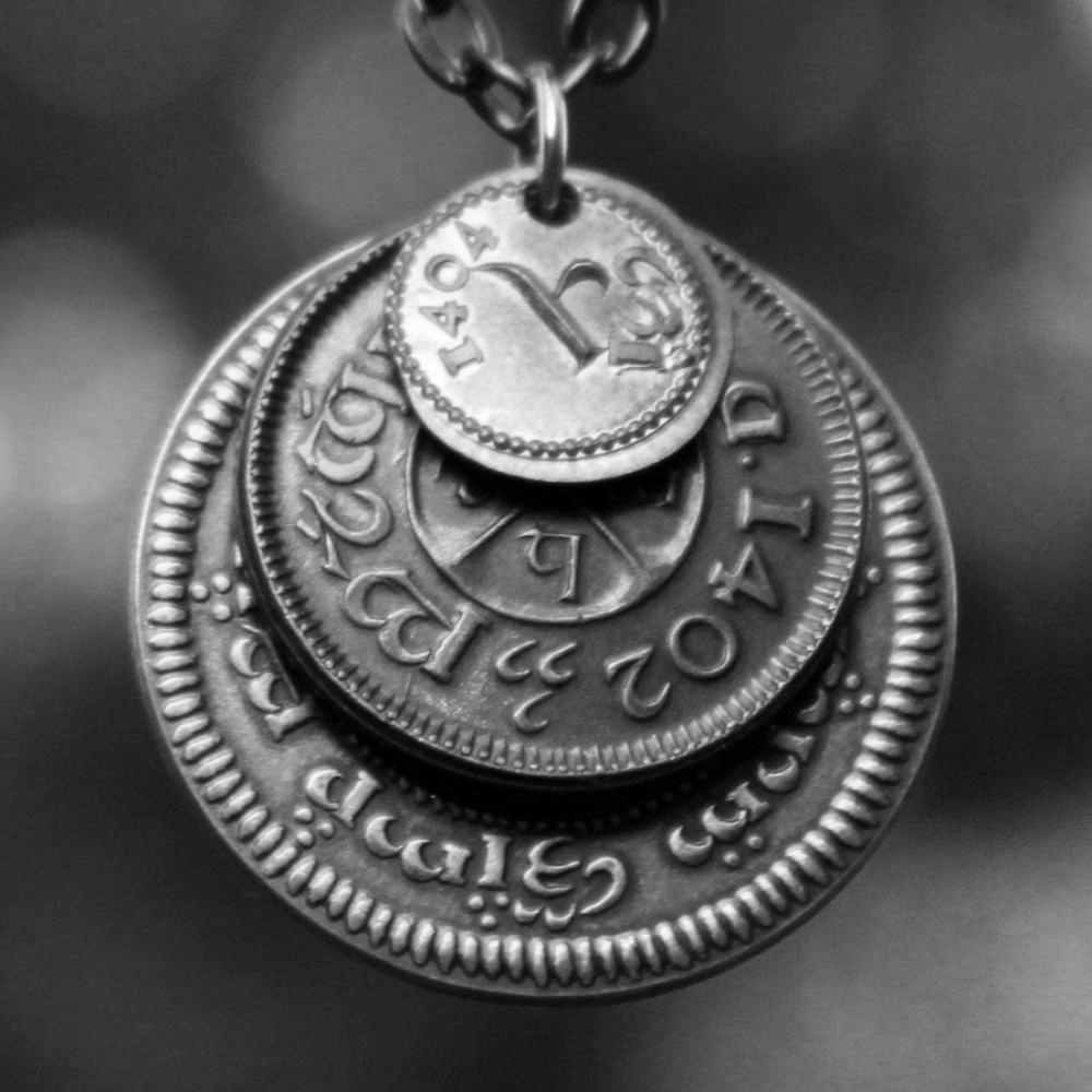 A 30" chain holds three coins from The Shire coins: a brass Shire Tuppence, a copper Shire Penny, and a tiny copper Shire Farthing. Coin text is inscribed in Tengwar. The coins will each feature a tree that will be one of the following variants: pine, elm, willow, and oak. The card inside provides translation of the coin text on each coin.