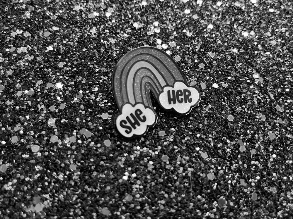 The Third Arrow Enamel Pronoun Pin: Rainbow & Clouds — She/Her