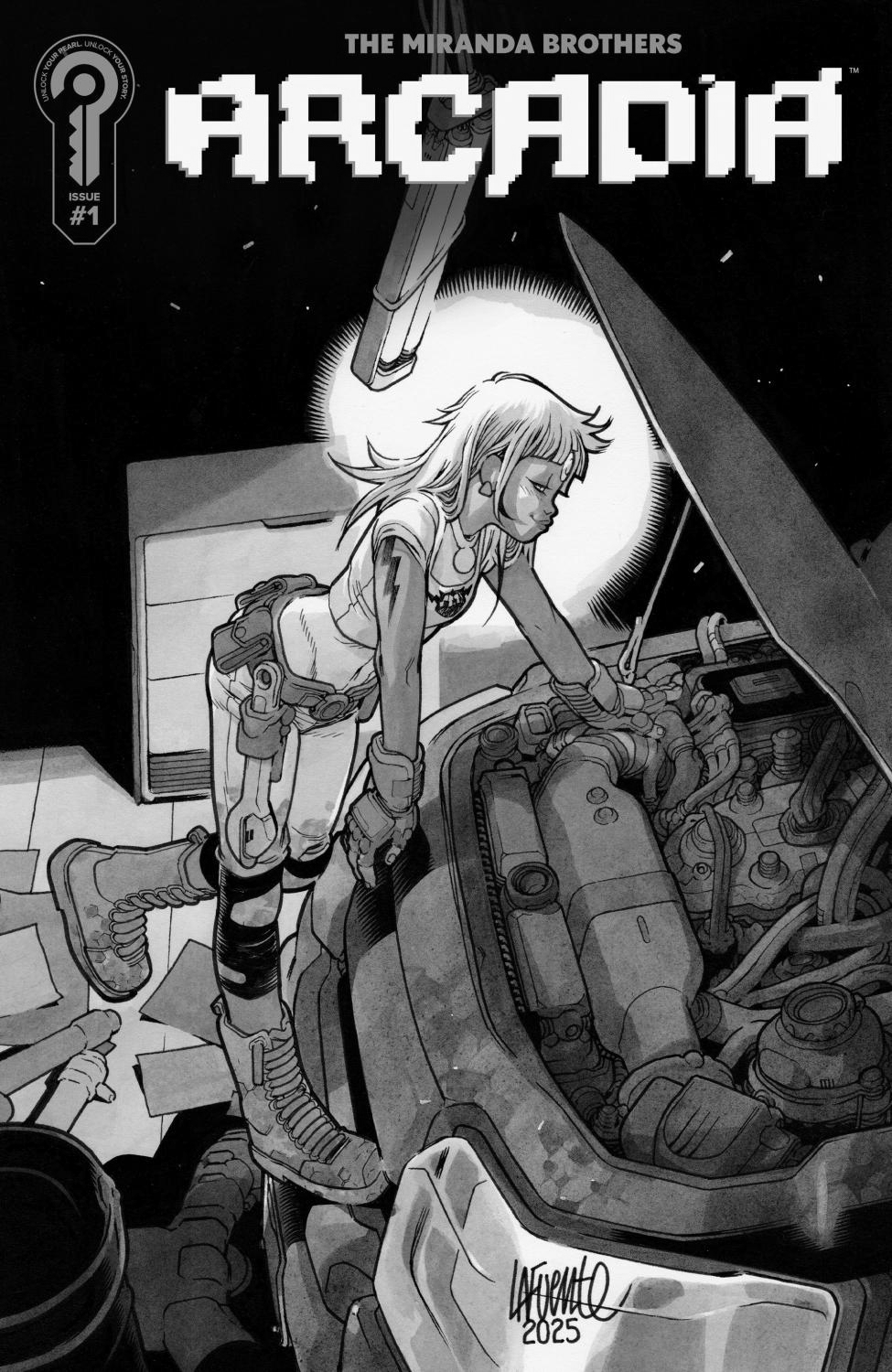In a future where humanity has vanished, a new form of life rises from the ruins: the Serants, artificial beings born from mysterious technological chrysalises known as Superdragons. Each one carries a Pearl, a biotechnological core that holds their consciousness, their memories…their soul.Halu is a Serant born late, emerging from a forgotten silo. He is rescued from destruction by Weedy, an eccentric scavenger obsessed with the remnants of the past and the search for meaning in their own existence. Soon after, Halu meets Fix, a practical, strong, and luminous young mechanic who awakens something deep within him. Together, in a world of ruins and dangers, they search for meaning, connection, and a reason to endure.Arcadia is a work of existential science fiction--profoundly human, where memory and love endure as a precious mystery that refuses to fade. A story that explores what makes us human…when humanity is no longer there to tell us the answer.A brand-new sci-fi epic courtesy of The Miranda Bros., the acclaimed creators of We Live and Blade Forger. This special incentive cover by superstar artist David Lafuente (Ultimate Comics Spider-Man) is available to retailers, 1 for every 5 copies of Arcadia ordered.