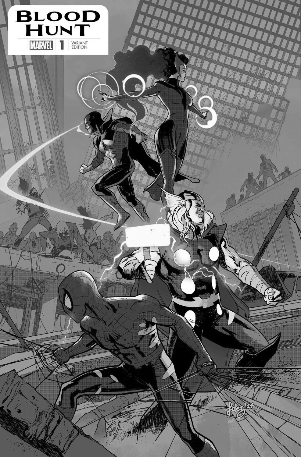 THE BLOODIEST MARVEL EVENT EVER! The skies have gone dark, the sun hiding its face from the carnage to come. The children of the night, the vampires, have risen from the dark and hidden places of the world as one to drown the Marvel Universe in blood. Earth's final night has fallen - can even the heroes of this doomed world stem the tide of blood that is to come? Join the AVENGERS, BLADE, BLOODLINE, SPIDER-MAN, HUNTER'S MOON, TIGRA, DOCTOR STRANGE and CLEA as the dance of death begins in BLOOD HUNT #1! On-Sale in May!