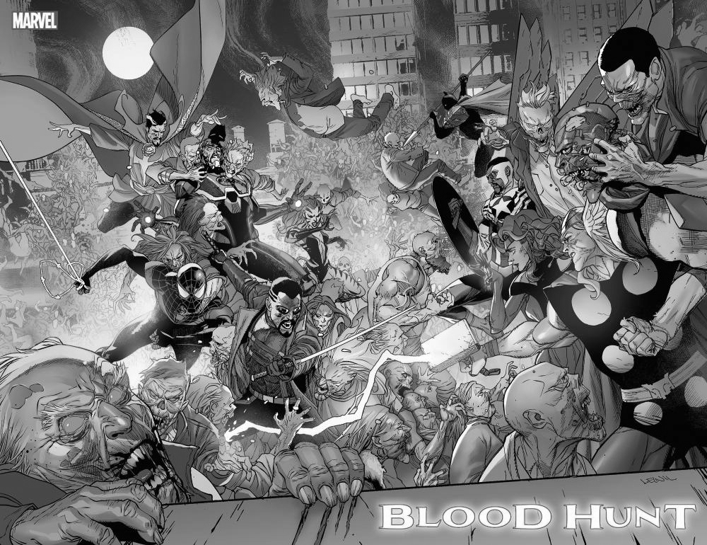 THE BLOODIEST MARVEL EVENT EVER! The skies have gone dark, the sun hiding its face from the carnage to come. The children of the night, the vampires, have risen from the dark and hidden places of the world as one to drown the Marvel Universe in blood. Earth's final night has fallen - can even the heroes of this doomed world stem the tide of blood that is to come? Join the AVENGERS, BLADE, BLOODLINE, SPIDER-MAN, HUNTER'S MOON, TIGRA, DOCTOR STRANGE and CLEA as the dance of death begins in BLOOD HUNT #1! On-Sale in May!