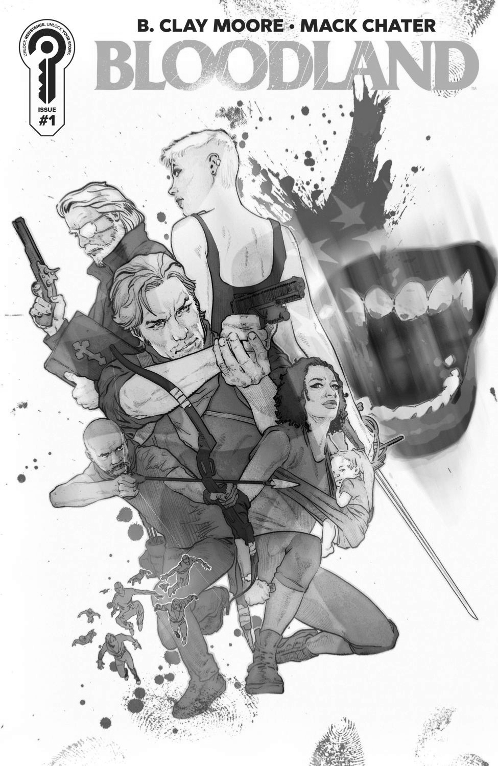 The United States is collapsing. And then there are the vampires.President Andrew Cross is deep into an unconstitutional extended term, seized and shielded by executive orders, martial law, and a stacked Supreme Court. With support splintering, Cross forges an alliance with a cabal of ancient European vampires. As the White Cell's influence expands, the administration's pursuit of power and blood purity transforms the landscape into a battleground between emboldened loyalists, aspiring demagogues, and colorful factions of dissenters. Against it all, Army veteran Heather Brooks is a lone wolf on a warpath to find and avenge her newborn son who's been sacrificed to the state; and retired pro quarterback Son Cassidy rallies an idealistic resistance. As their courses collide, the two leaders will tilt the odds and change the shape of a cross-country war for the soul of a nation. Monsters pull the strings in this debut of Bloodland, a savage and sweeping 12-issue political horror reuniting B. Clay Moore (The Leading Man; Bloodshot) and artist Mack Chater (Stranger Things: Tales from Hawkins)!