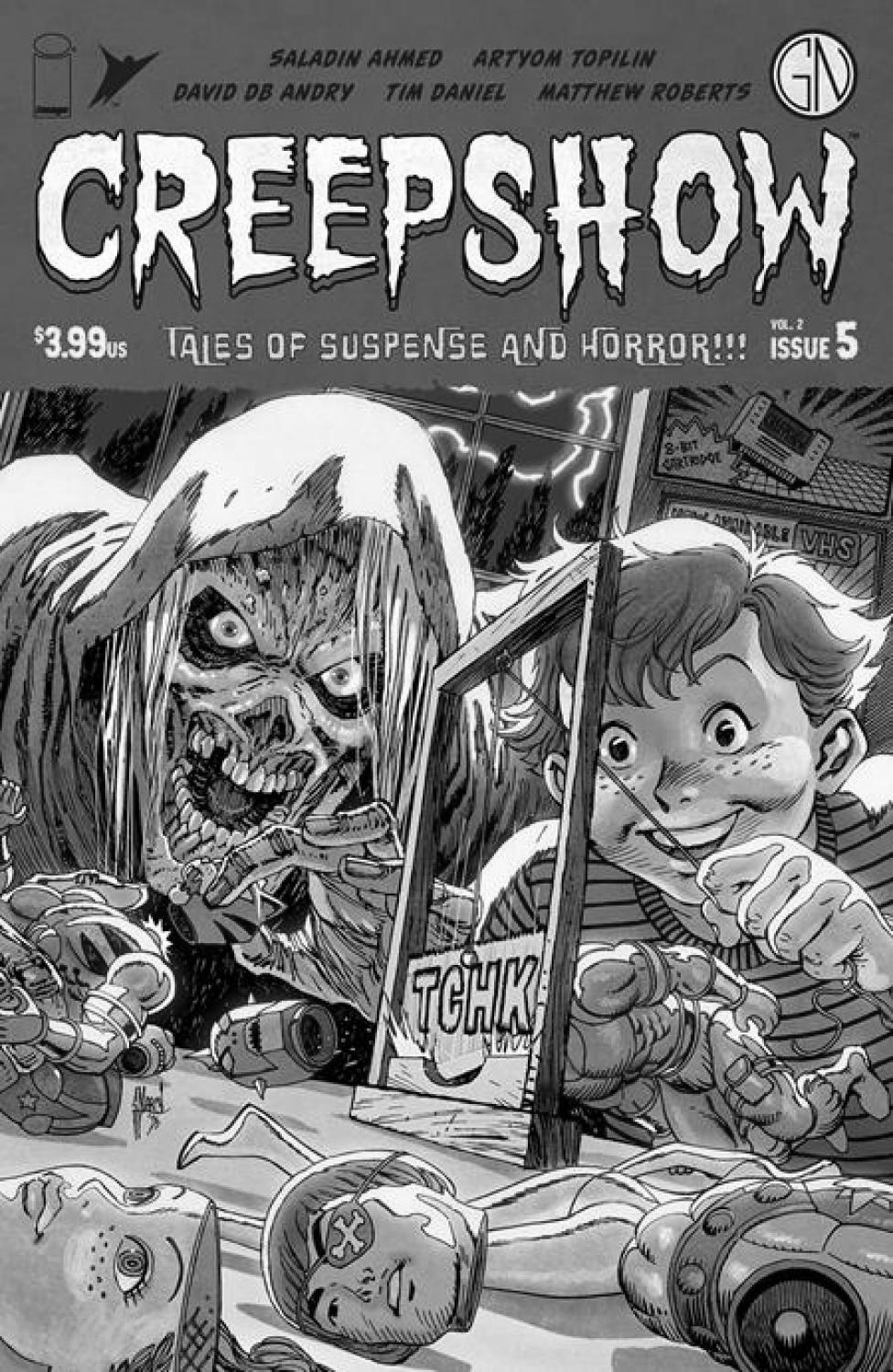 Mini-Series Finale. Welcome to the freaky finale of Creepshow Volume 2! First, sinister Saladin Ahmed (Miles Morales: Spider-Man) & hair-raising Artyom Topilin (I Hate This Place) spin a horrifying yarn about a politician who tries to protect the youth from 'dangerous' comic books in 'Burning Ambition'! Then, dastardly DB Andry & terrifying Tim Daniel (End After End) are joined by murderous Matthew Roberts (Manifest Destiny) to tell the story of a boy who sacrifices the things he loves to feed the monster under his bed in 'Keep It Fed'!