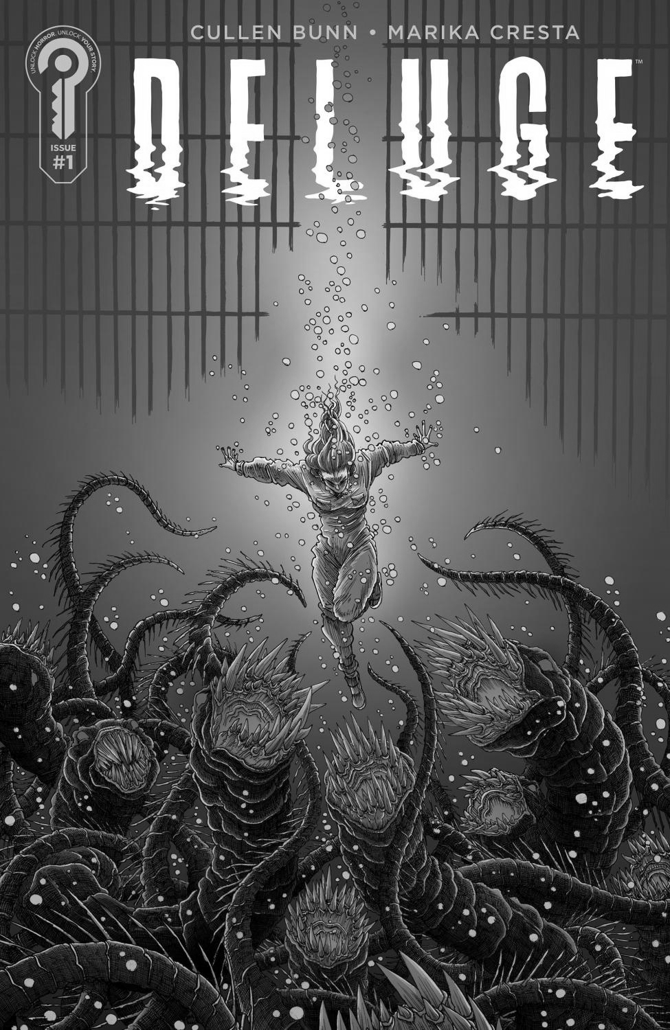 A hard rain is falling on Sieverville Correctional Prison for Women. As the river rises and its banks overflow, the same walls that are keeping the prisoners inside the fortress-like structure are failing to keep the water out. With that water comes something else. Something deadly. What was once outside is now inside, and the prisoners and guards will have to find a way free, because if the water doesn't get them, the monsters will. In this terrifying new horror series from Cullen Bunn (The Sixth Gun, Harrow County) and Marika Cresta (Dr. Aphra) readers will follow a group of inmates as they attempt to traverse the flood waters while also avoiding both the very real monsters that are swimming beneath the surface and the proverbial monsters from their lives before incarceration that lurk inside themselves.This special variant boasts an exclusive cover by James Stokoe (Orc Stain, Orphan and the Five Beasts)! Stores can purchase one copy of this variant for every 5 copies of Deluge #1 ordered!
