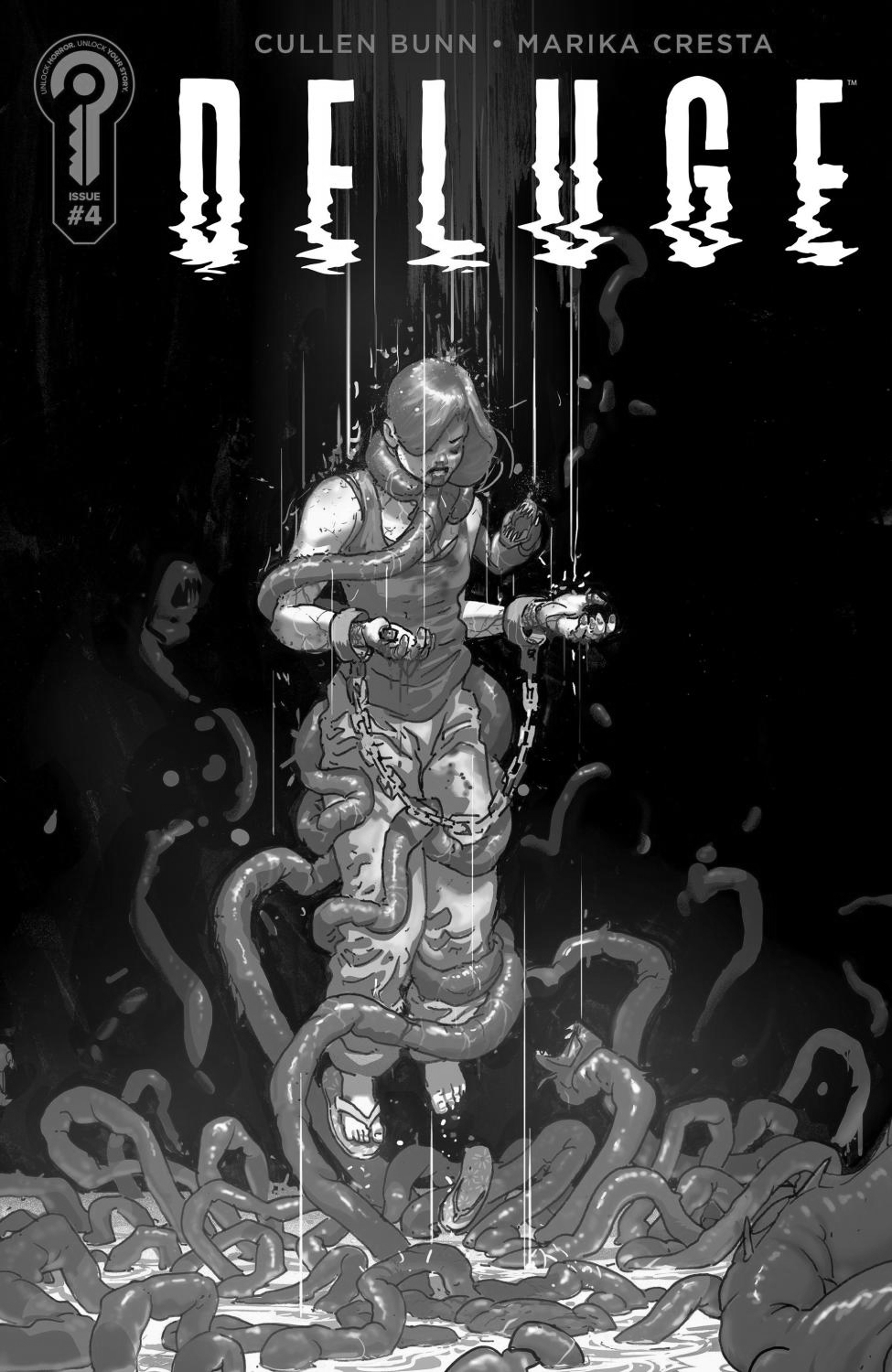 The rain continues to fall, and the corridors continue to flood, bringing more monsters into the prison. The surviving guards and inmates are starting to realize, however, that the deadliest threat they are facing is themselves. If the infighting doesn’t get them, then the sins of their past will. When faced with the spectral embodiments of their crimes, some of the women would rather perish in the jaws of the evil creatures that are hunting them. Can Maggie lead one last push to find an escape before it’s too late?Deluge reaches its penultimate issue, as writer Cullen Bunn (Harrow Country, Deadpool Destroys the Marvel Universe) and artist Marika Cresta (Star Wars: High Republic) open the floodgates of fear!