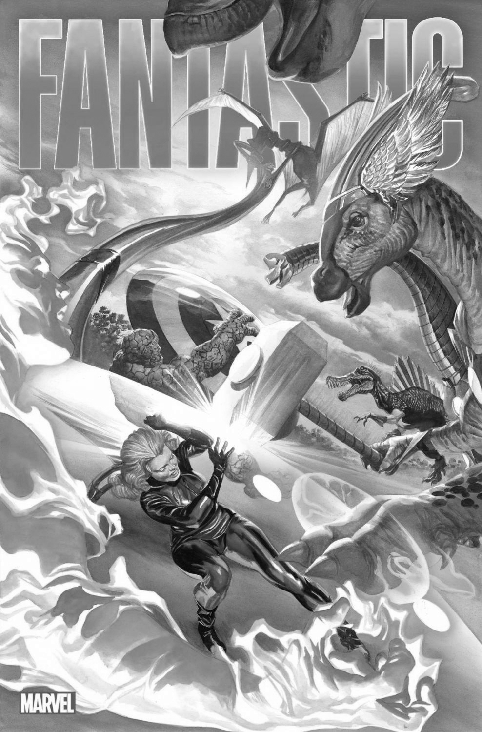 What happens when a parallel world starts out different from our own but, through random chance and development, begins to resemble our Earth more and more closely? And what happens when those two universes begin to merge not just in style, but literally? It's a fascinating scientific question that the Fantastic Four will have to consider as they swap places with their counterparts in this other world and find themselves battling for survival in the universe where everyone is a dinosaur, and not anthropomorphic ones, but literal full-scale dinosaurs with all their super-powers, wearing amazing super-hero costumes! Can Sue Storm defeat Brachiosaurus Iron Man? Can the Human Torch take down Lambeosaurus Captain Marvel, her head frill mimicking her human counterpart's spiked hair? Can Reed Richards ever stop Quetzalcoatlus Black Widow, the deadly assassin of the skies? Beyond the dinosaurs and chaos and two universes merging, this issue also features emotional and heartfelt reunions with some missing members of the Fantastic Four family! So: Dinosaurs and catharsis, together at last. Plus: Sue Storm's doctorate is finally revealed!