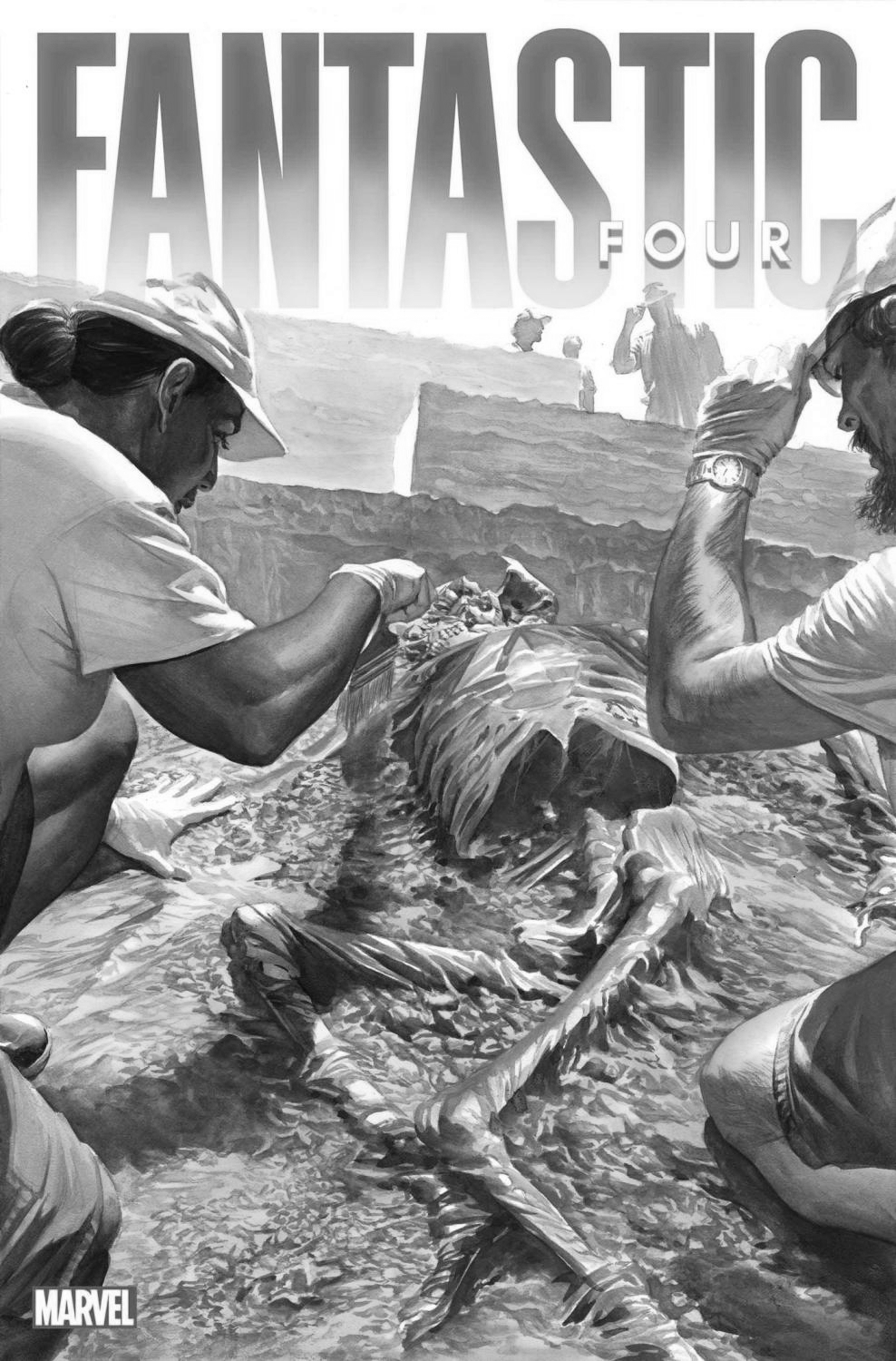When construction unearths something unexpected, Susan Storm is called in - not as a super hero but an archaeologist! But when the bones she uncovers - tens of thousand of years old, dating back to the first arrival of humans in the Americas - turn out to be female...and matching her build...and wearing the shredded and decayed remains of what appears to be BLUE FABRIC constructed of unstable molecules, she must accept the fantastic: Dr. Susan Storm is going to DIE deep in Earth's prehistory... ...and that time is coming sooner than she might think! Also in this issue: an anniversary date for Reed and Sue! So Sue gets both inarguable evidence of her own death AND some romance.