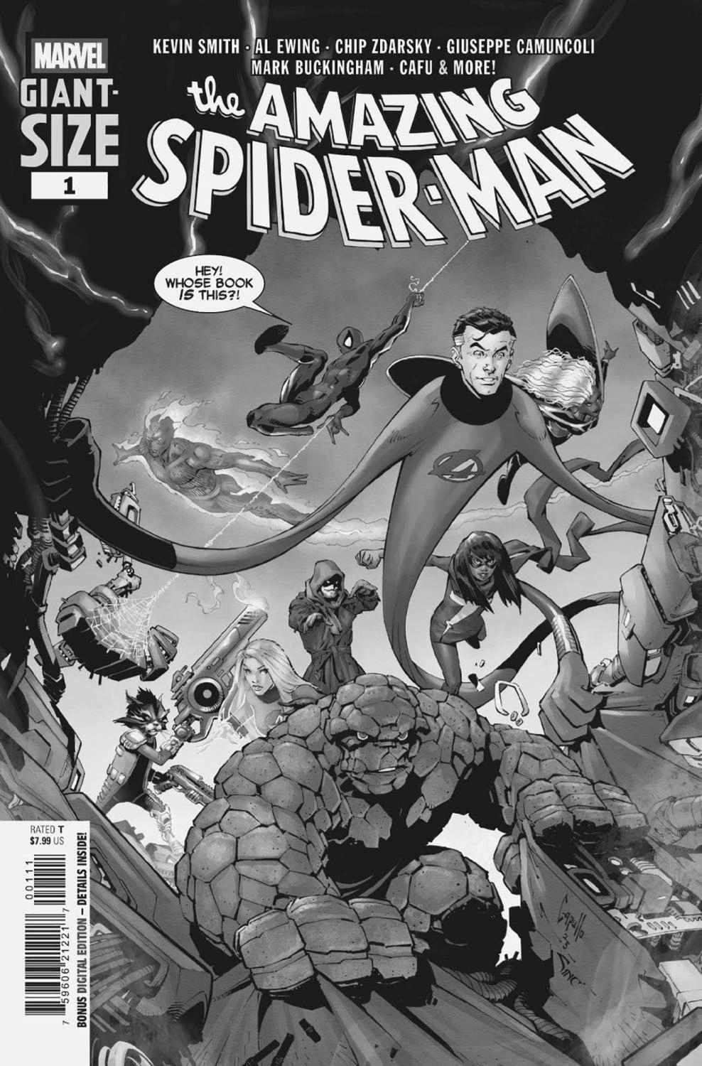 Summer starts with a bang with GIANT-SIZE AMAZING SPIDER-MAN #1! Kevin Smith makes his triumphant return to Marvel with a Spider-Man story that will have your heart beating in overdrive and your sides hurting from how much you're laughing. As if that wasn't enough, Al Ewing and Mark Buckingham spin a decade-spanning adventure with Spider-Man and some of his best friends! And if that weren't enough, Chip Zdarsky and CAFU introduce a brand-new character who will play a big role in the future of Marvel Comics! Don't miss it! Rated T
