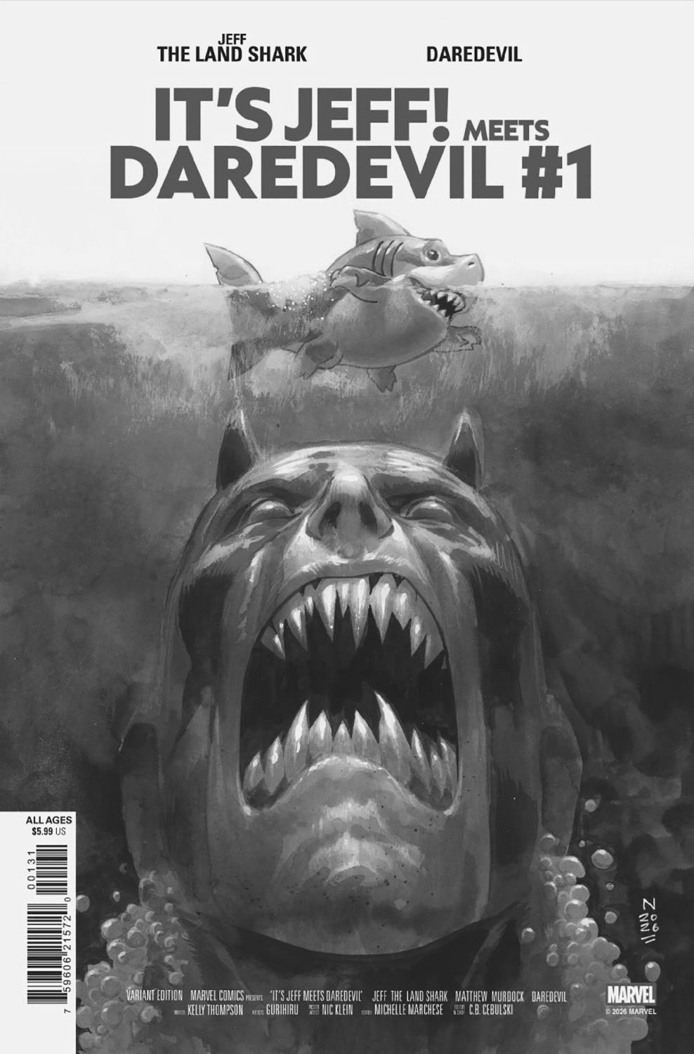 THE ADVENTURES OF JEFF THE LAND SHARK CONTINUE WITH DAREDEVIL! In this special new story from star Jeff team Kelly Thompson and Gurihiru, Jeff the Land Shark learns the meaning of courage from THE MAN WITHOUT FEAR! Plus, the latest season of IT'S JEFF appears in print for the very first time so you can enjoy all the adorableness and chaos the way Daredevil himself would - without a phone screen!!! Don't miss what happens when Jeff wins the lottery, goes to the groomer, and best of all... TAKES ON THE HULK!