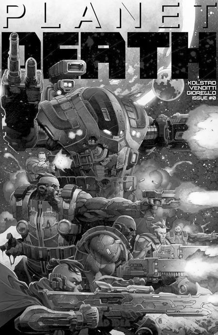 Blockbuster screenwriter Derek Kolstad, creator and writer of the internationally acclaimed, box office dominating motion picture franchise JOHN WICK, New York Times best-selling writer Robert Venditti (Superman ‘78, Green Lantern), with visionary artist Tomás Giorello (Star Wars, Conan) and ten-time Eisner Award-winner Dave Stewart (Star Wars, Hellboy) have combined forces to bring you this essential first chapter in a groundbreaking new sci-fi epic.Millions of miles from home, hundreds of ships descend into the stormy atmosphere of a hostile frozen world. On board, an army of resolute men and women brace for the coming assault.They are an invasion force, on an impossible mission — destroy the devastating enemy weapon garrisoned below. Corporal Scott and his battalion are in the vanguard but the human forces are no match for their brutal alien adversaries. Scott's battalion is dead within moments. He is its lone survivor. The landing force annihilated, the battle is lost.Against overwhelming odds, Scott dares the unthinkable — cross behind enemy lines, survive the lethal landscape, evade capture by ruthless enemies, resist natural predators, face human deserters and finish the mission singlehandedly. Locked in his suit of full combat battle armor, sustained only by what he can carry, and driven by Earth's wrath, Scott must do by himself what an entire army could not.Destroy the weapon.Return home. PLANET DEATH #0 is the must-read lead-in to July's 40-page prestige format PLANET DEATH #1.