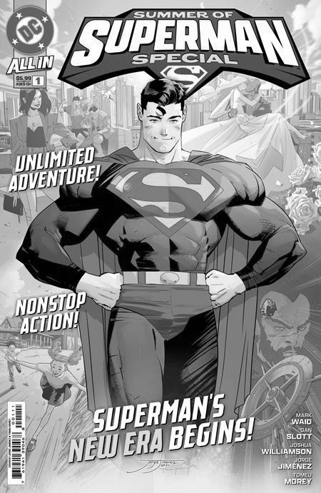 THIS IS IT! SPRING INTO THE SUMMER OF SUPERMAN! The Man of Steel and his universe of friends, family, allies, and rogues is in for some big changes, and it all starts in the Summer of Superman Special! Brought to you by Superman series architects Joshua Williamson (Superman), Mark Waid (Superman: Action Comics), and (making his grand entrance to the world of tomorrow) Dan Slott, this special oversize issue will set the stage for all the major events exploding throughout the Superman titles! When John Henry Irons and Lana Lang take their vows, everyone turns up for the big day--but trouble is brewing on the horizon, as threats from the past, present, and future kick off major new conflicts for the Superman Family. Brought to stunning life by the incomparable art of Jorge Jimenez (Batman, Super Sons), the Summer of Superman Special is the ground floor to the most exciting action imaginable in 2025!