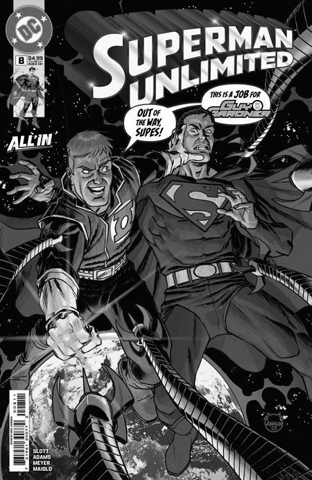 GUEST STARRING GREEN LANTERN GUY GARDNER! Thanks to Toyman's Kryptonite generators, Earth is finally ready to mass-produce commercial faster-than-light rockets...for the planet's richest one percent. And who wouldn't want Earth's multibillionaires traveling among the stars? Everyone. Every single being in the entire cosmos. It's up to Superman and special guest star Guy Gardner to save the launch of Simon Stagg's new space yacht from one of the deadliest cosmic beings in the galaxy!