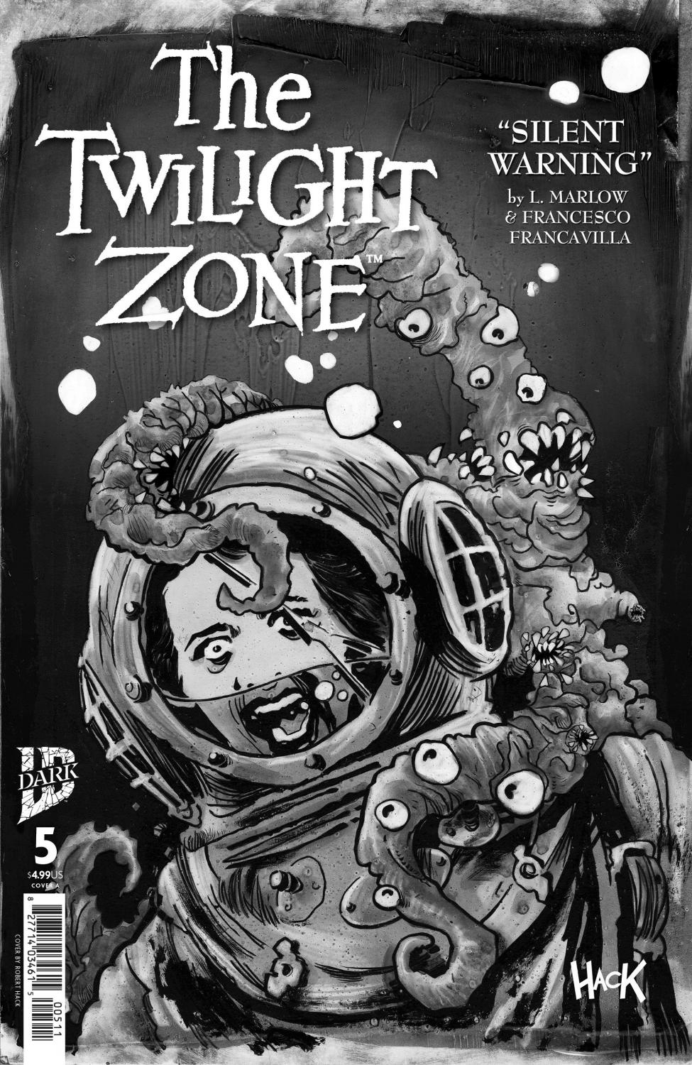 This all-new Twilight Zone anthology series comes to a close with its final standalone issue! Our fresh tale resonates with the iconic original television show that’s captivated audiences for over 60 years. And like the show, this story will be revealed in terrifying black and white!This issue: Imagine, if you will, a world where the urgency of science meets the obstinance of humanity. Submitted for your approval, the tale of a brilliant scientist who finds herself on the brink of a monumental discovery. A meteor emitting cryptic audio waves has crashed into the ocean and plummeted into its depths. Only she has the skill to decode its signals. But in the Twilight Zone, even the most crucial warnings can be drowned out by the cacophony of ignorance.Francesco and L. Marlow Francavilla (The Black Beetle, The Black Coat, Detective Comics) are our guides for this latest expedition into the Twilight Zone. See you on the other side, brave readers…