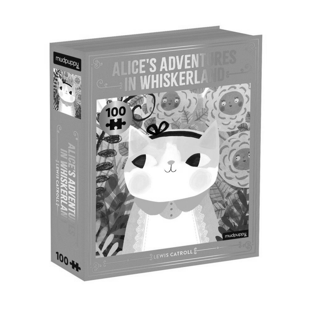Alice's Adventures in Whiskerland Bookish Cats 100 Piece Puzzle from Mudpuppy features an adorable cat portrait of Alice, clever kitty-inspired title and author name. Part of Mudpuppy's Bookish Cats series, this premium puzzle is packaged in a book-style box with magnetic closure and has gold foil embellishments on both puzzle and box.