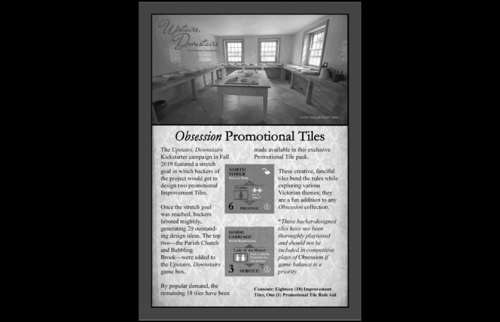 NOTE: All tiles require the Obsession base game, and six tiles require the Upstairs, Downstairs expansion.